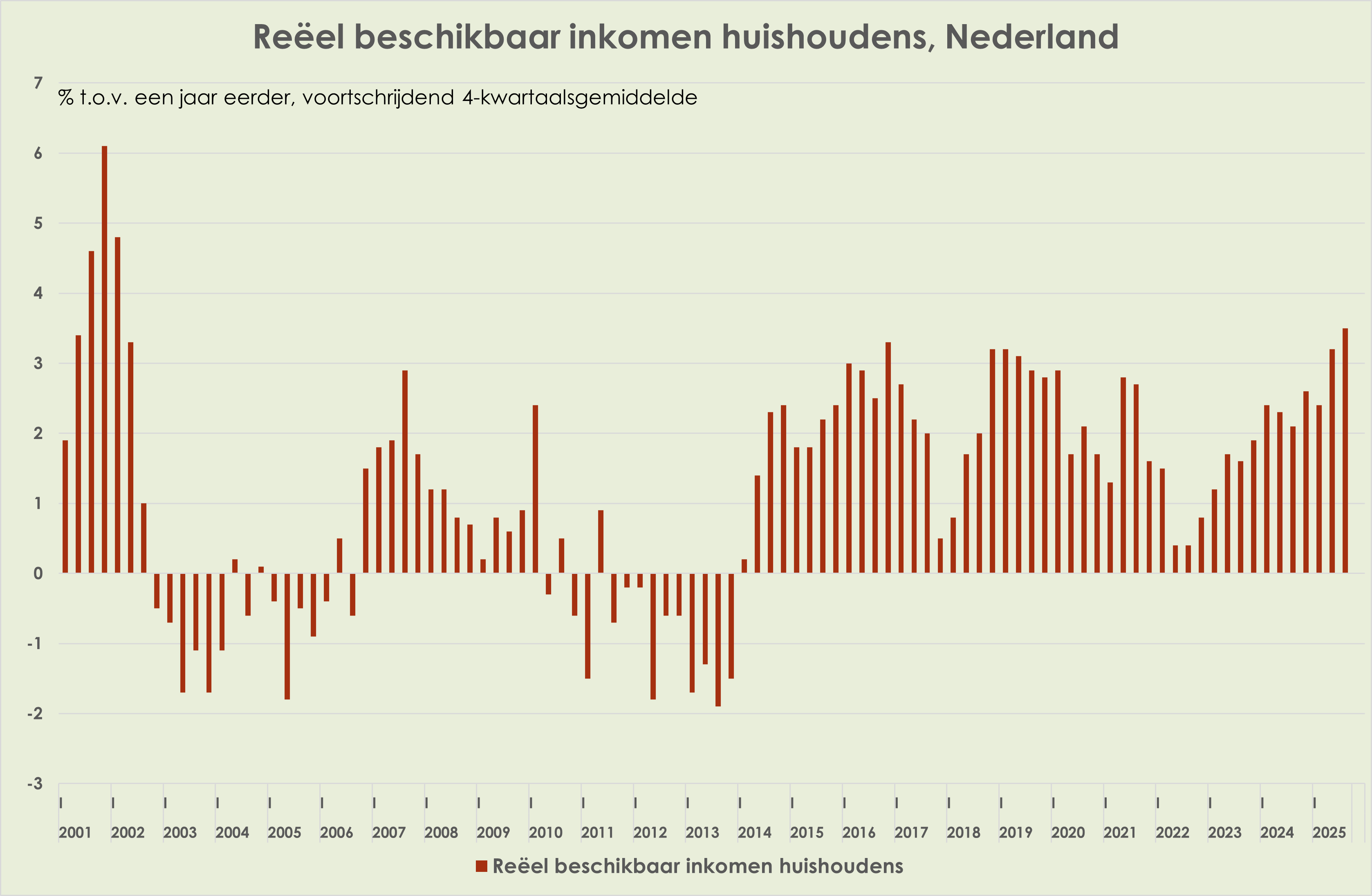 50. Het reëel beschikbaar inkomen van huishoudens (totaal, niet per huishouden, voortschrijdend 4-kwartaalgemiddelde) is opgelopen van 3,2% in het 2e kwartaal tot 3,5% in het 3e kwartaal, sterkste stijging in ruim 23 jaar (sinds het 1e kwartaal van 2002) (zie grafiek hieronder) (link)