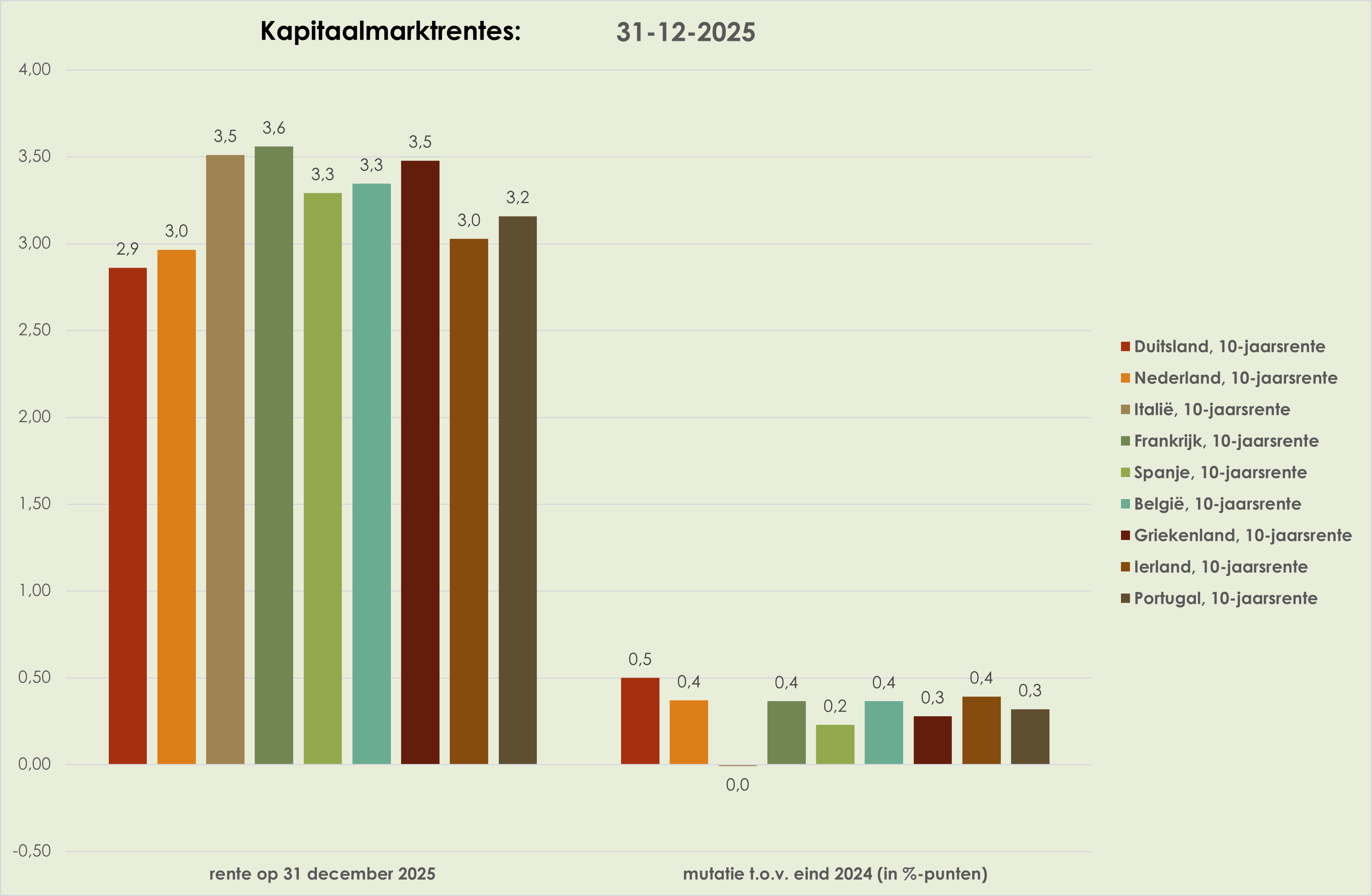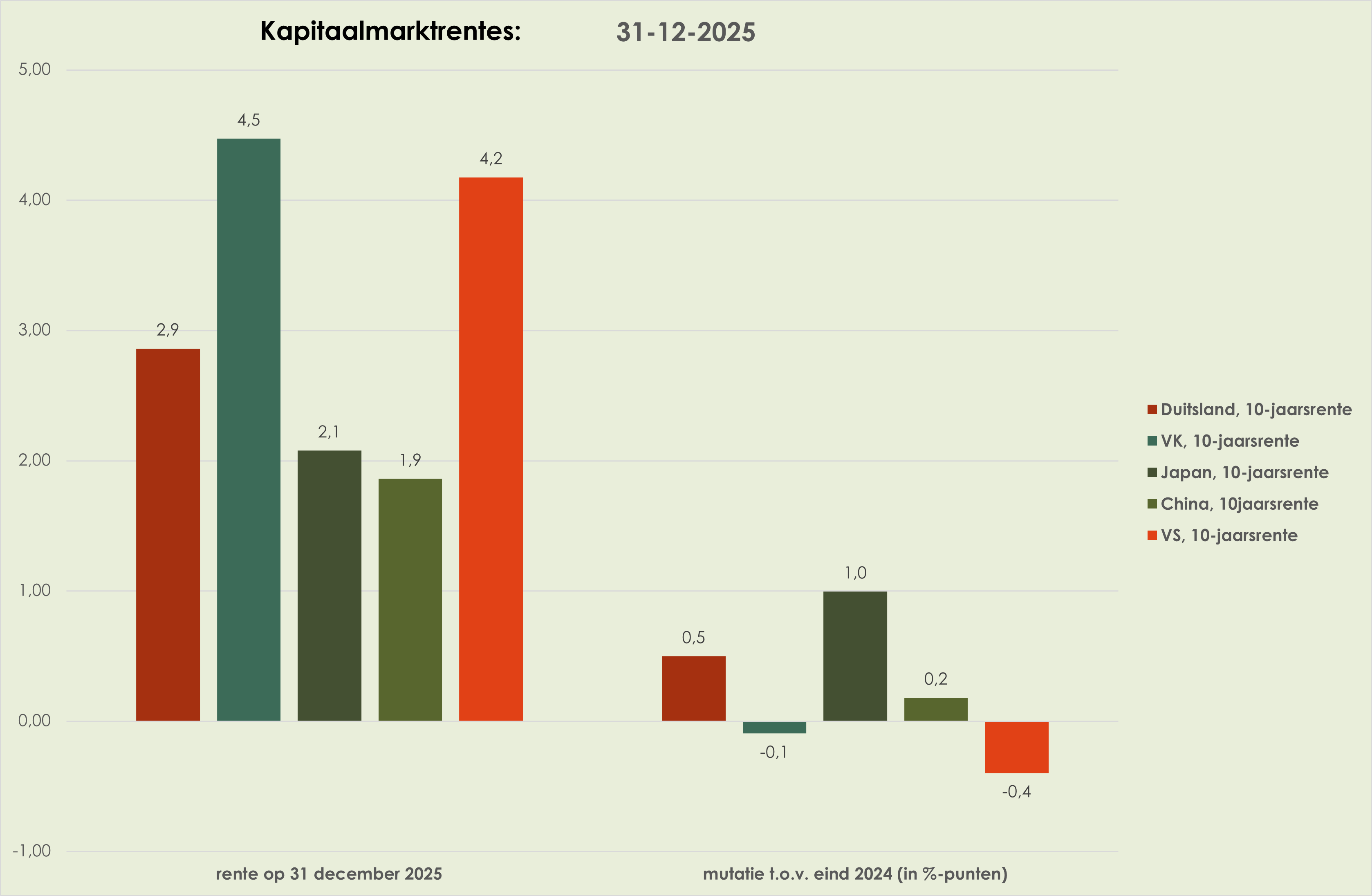 34. In 2025 daalde de Amerikaanse 10-jaarsrente met 0,4%-punt, steeg de Duitse rente met 0,5%-punt en de Japanse rente met 1,0%-punt; hierdoor namen de renteverschillen af, maar bleef de Amerikaanse rente duidelijk hoger dan de Duitse rente.