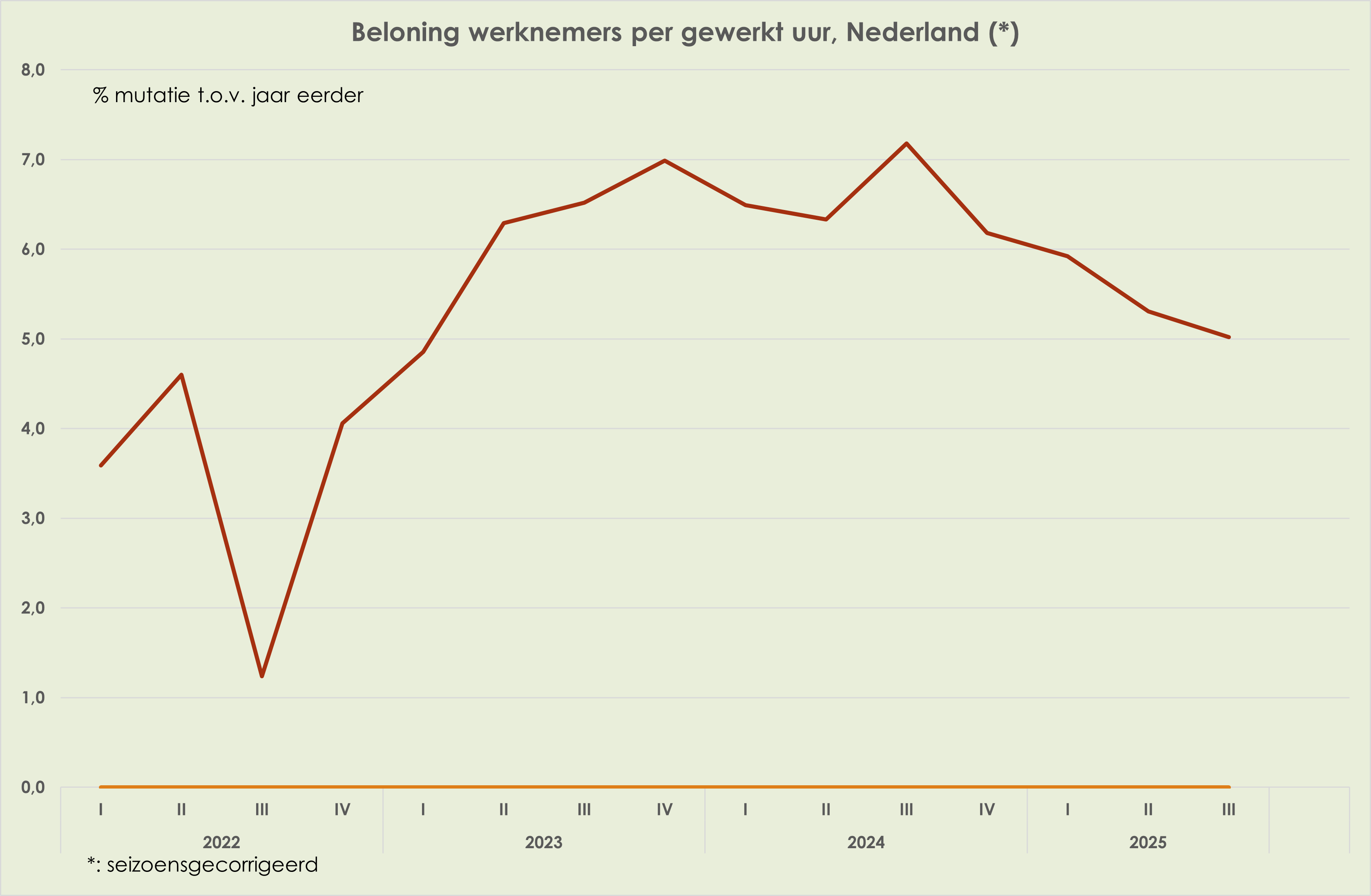 49. De stijging van de beloning van werknemers per gewerkt uur is verder afgezwakt, van 5,3% t.o.v. een jaar eerder in het 2e kwartaal tot 5,0% in het 3e kwartaal, kleinste stijging sinds het 1e kwartaal van 2023. (zie grafiek hieronder)