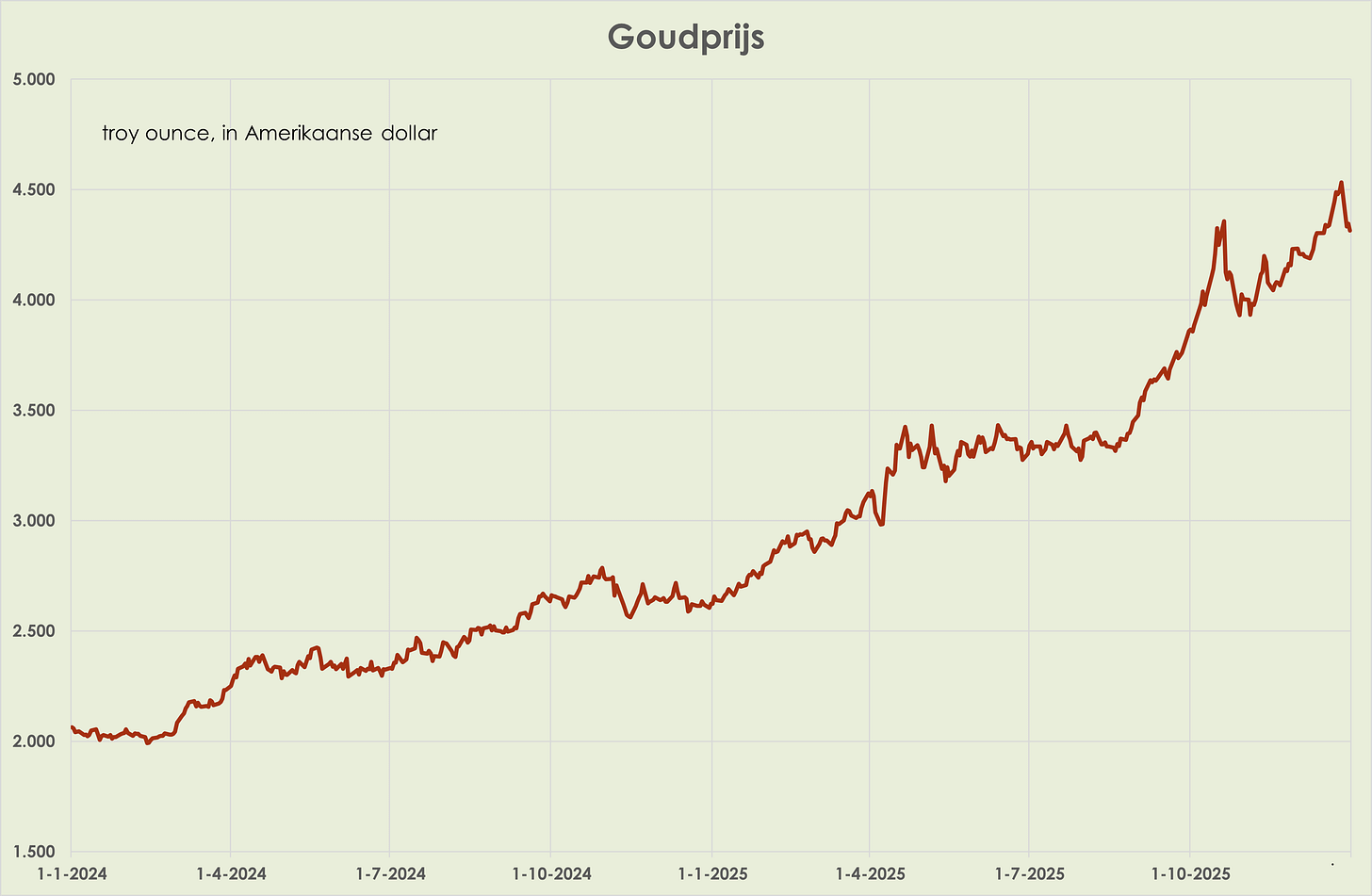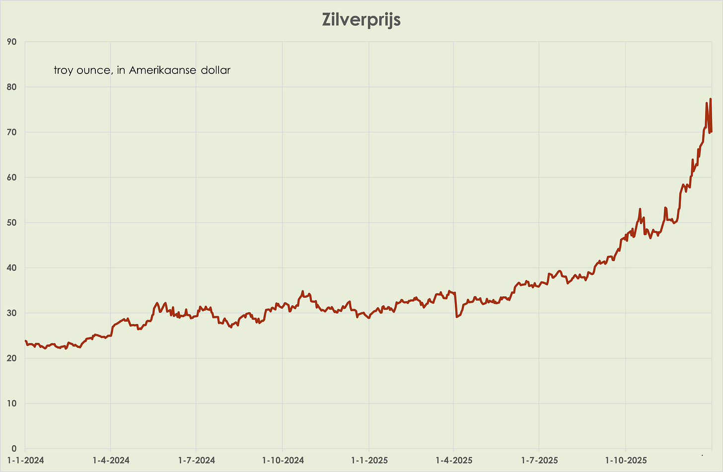 39. Goud: de goudprijs bereikte in de anderhalve week tot oudjaar een nieuw all-time-high, maar daalde desalniettemin in deze periode 0,5%. (zie grafiek hieronder). Eind 2025 was de goudprijs 64,5% hoger dan een jaar eerder, na een stijging van 27,2% in 2024. (link) De zilverprijs bereikte in de anderhalve week tot oudjaar een nieuw all-time-high en steeg per saldo 4,9% in deze periode, ondanks de forse daling op 31 december van 9,4%. Eind 2025 was de goudprijs 142% hoger dan een jaar eerder, na een stijging van 21,3% in 2024 (zie grafiek hieronder)
