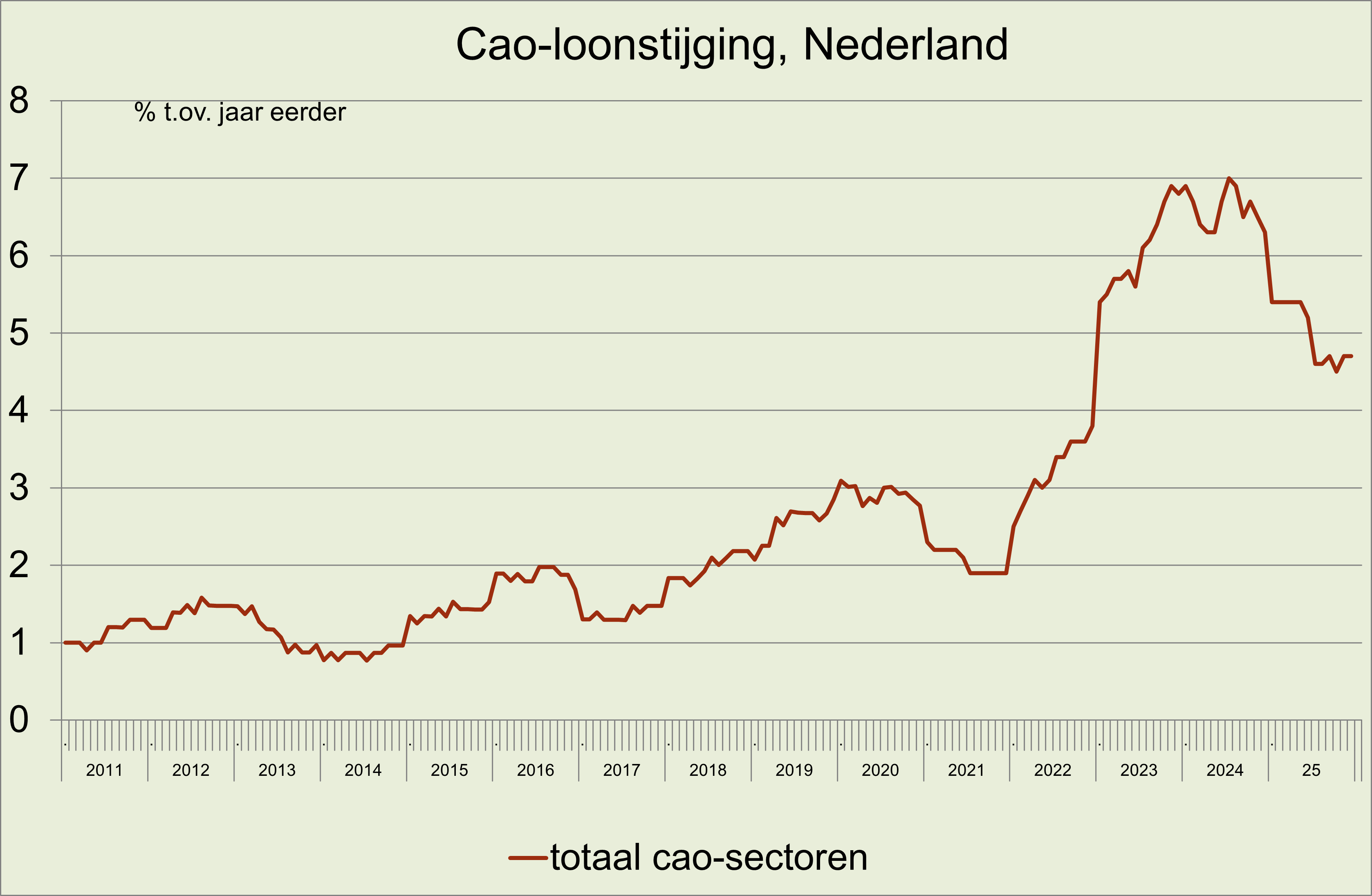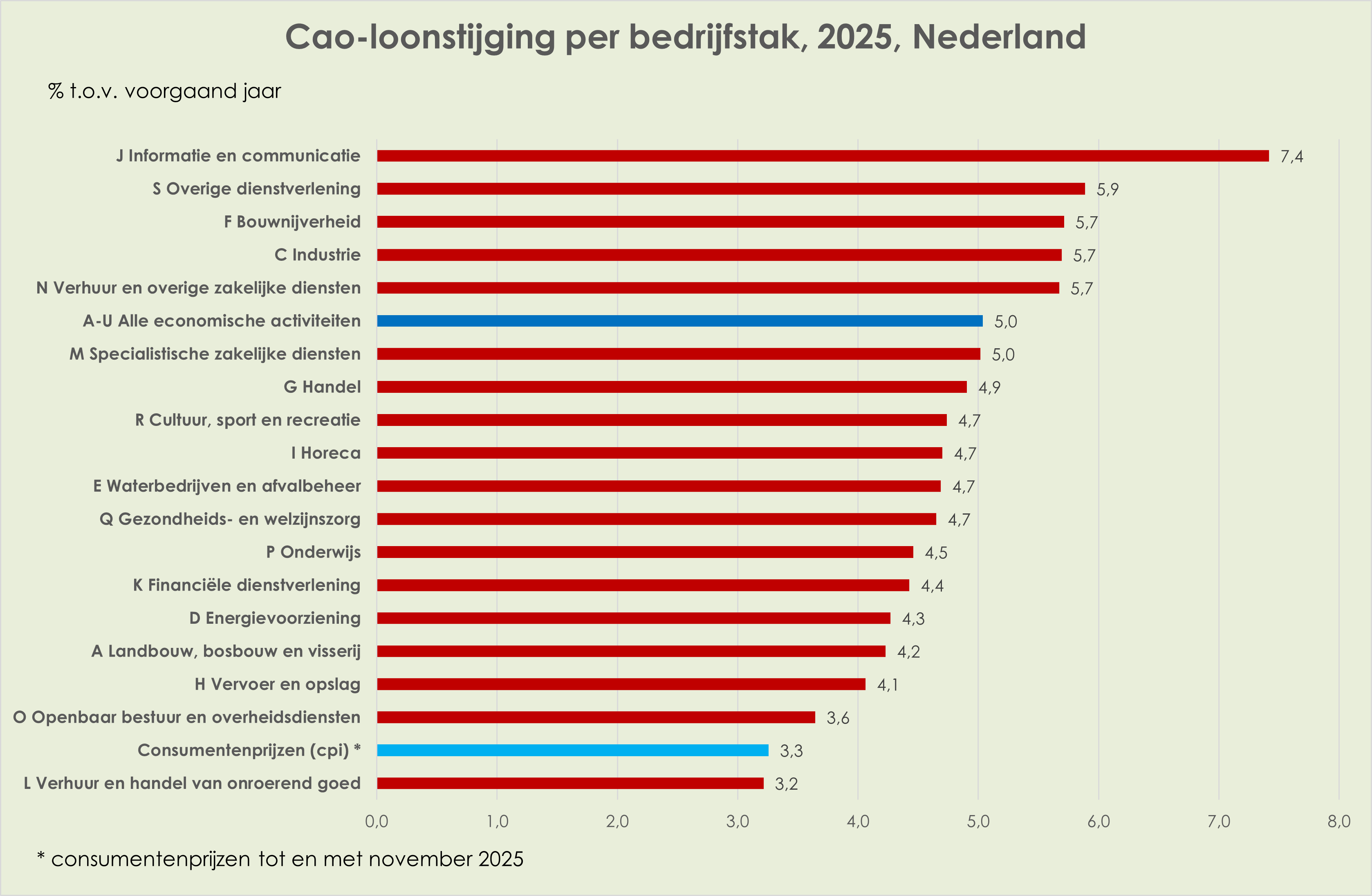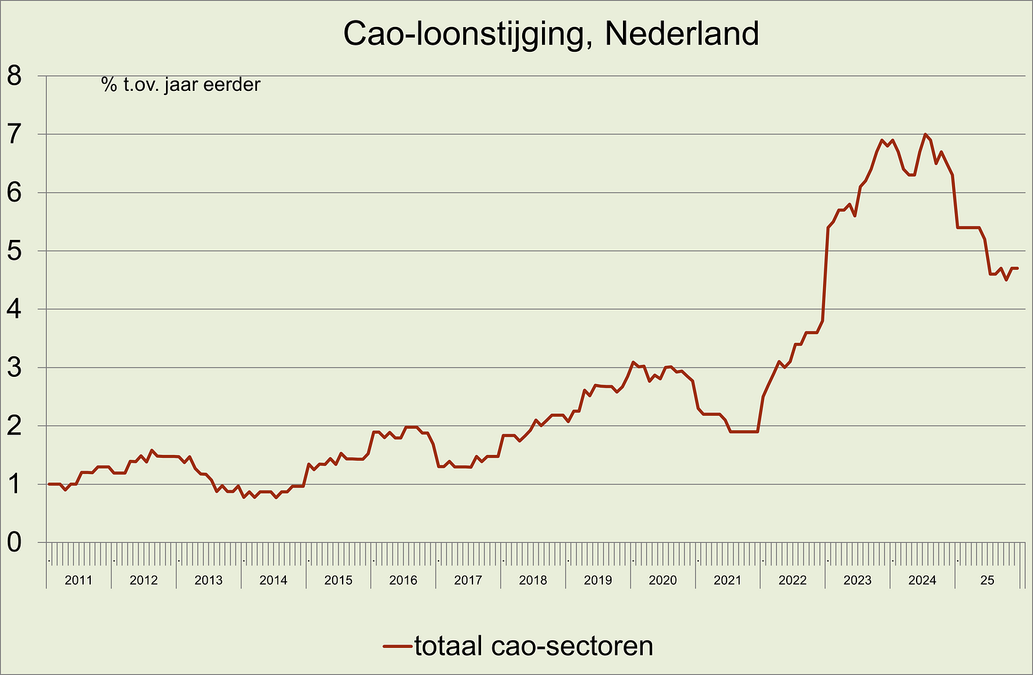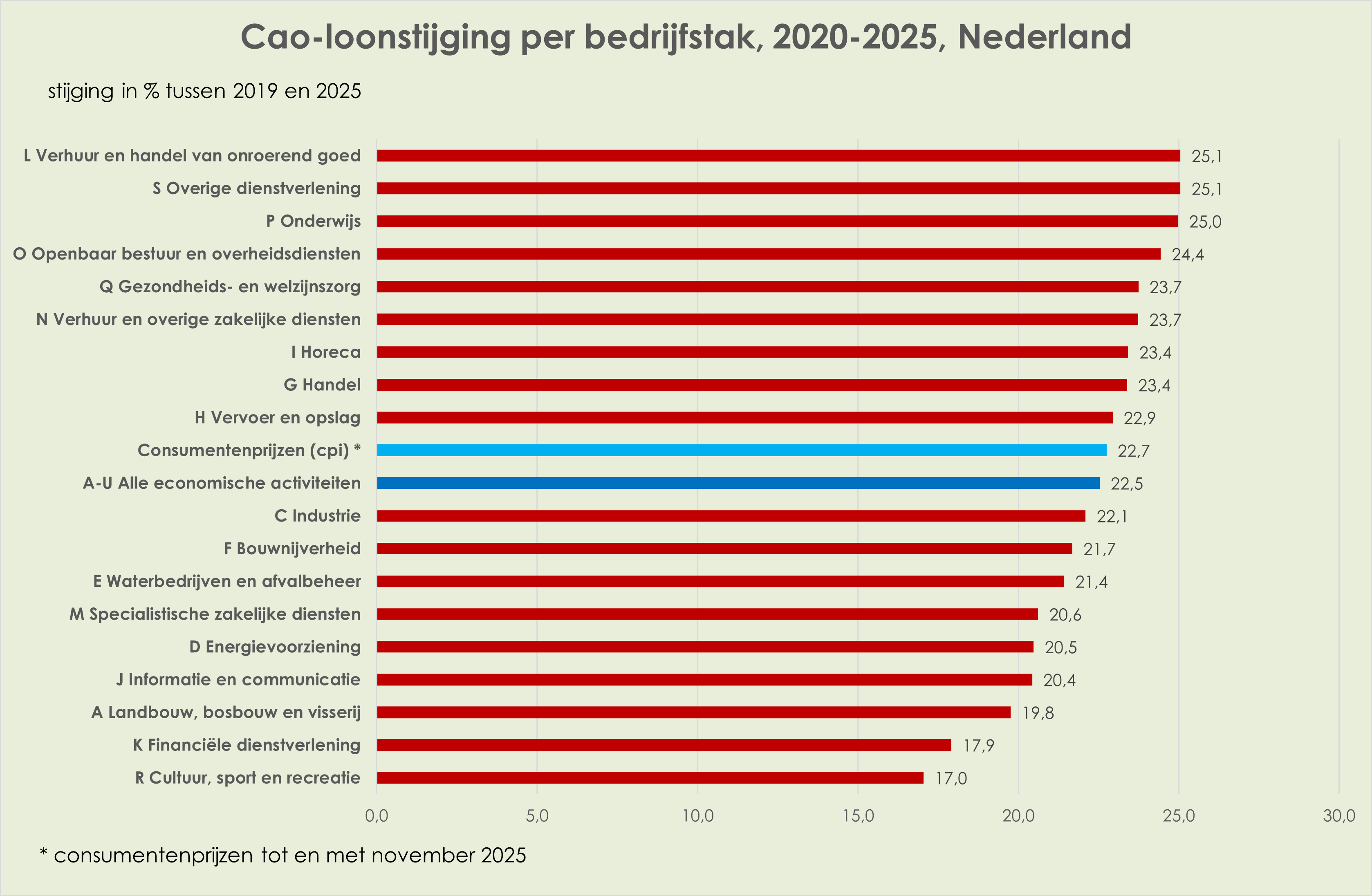 56. De cao-lonen zijn in december, net als in november, gestegen met 4,7% t.o.v. een jaar eerder. Gemiddeld in 2025 stegen de cao-lonen 5,0% t.o.v. het voorgaand jaar, een afzwakking van de recordstijging van 6,5% in 2024. De loonstijging overtrof in 2025 de consumentenprijsstijging (circa 3,3%). De cao-loonstijging varieerde in 2025 van 3,2% voor onroerend goed (woningcorporaties) en 3,6% voor openbaar bestuur tot 7,4% voor de bedrijfstak informatie en communicatie. (De zwakke stijging voor onroerend goed volgde op een zeer sterke stijging van 12,4% in 2024). In de jaren 2020 tot en met 2025 was de cao-loonstijging (22,5%) marginaal lager dan de consumentenprijsstijging (circa 22,7%); in deze periode varieerde de cao-loonstijging van 25% voor de bedrijfstak onroerend goed tot 17% voor de bedrijfstak cultuur, sport en recreatie (link)