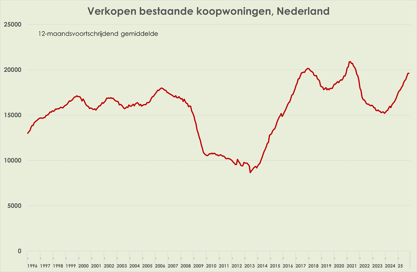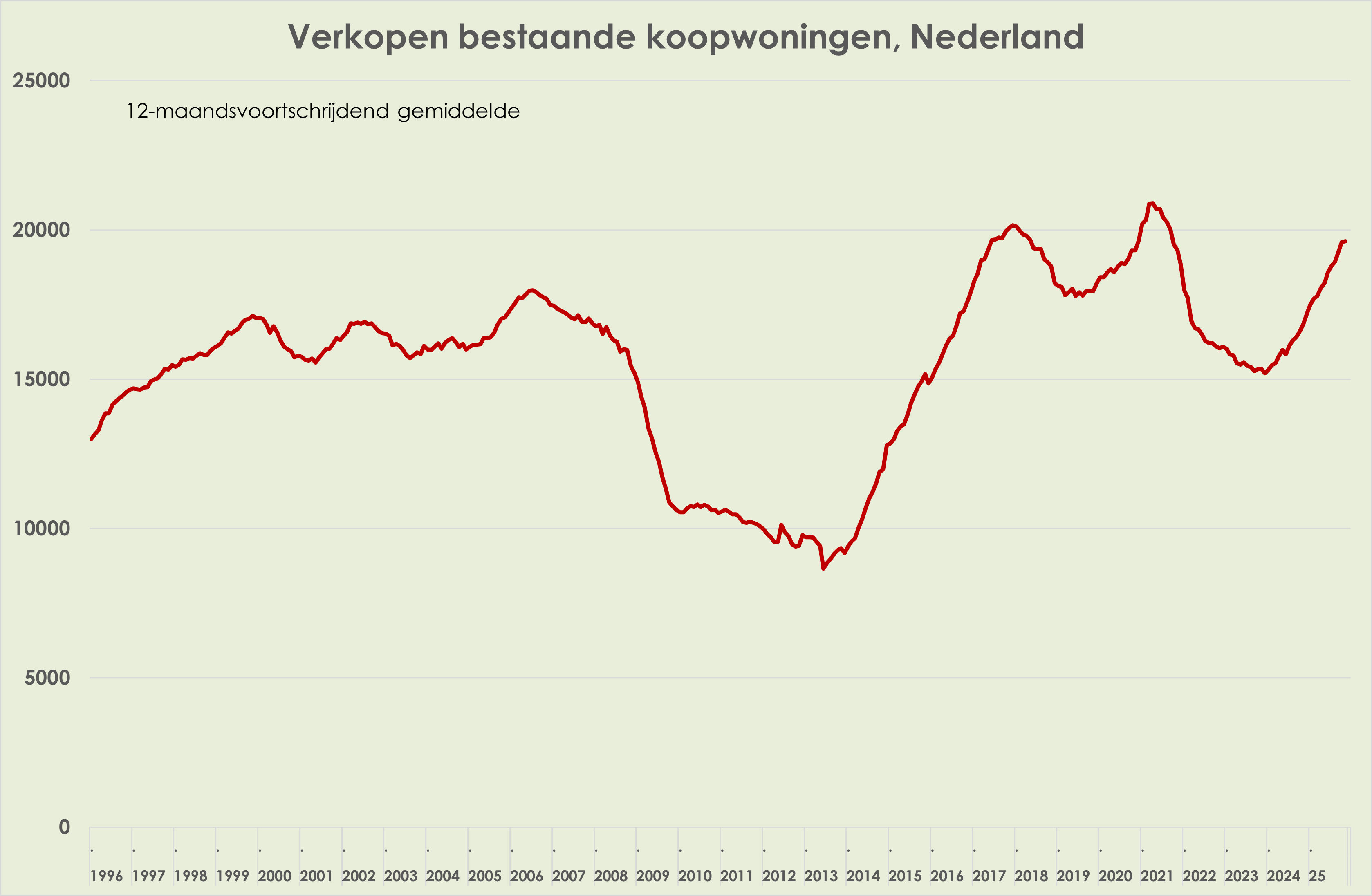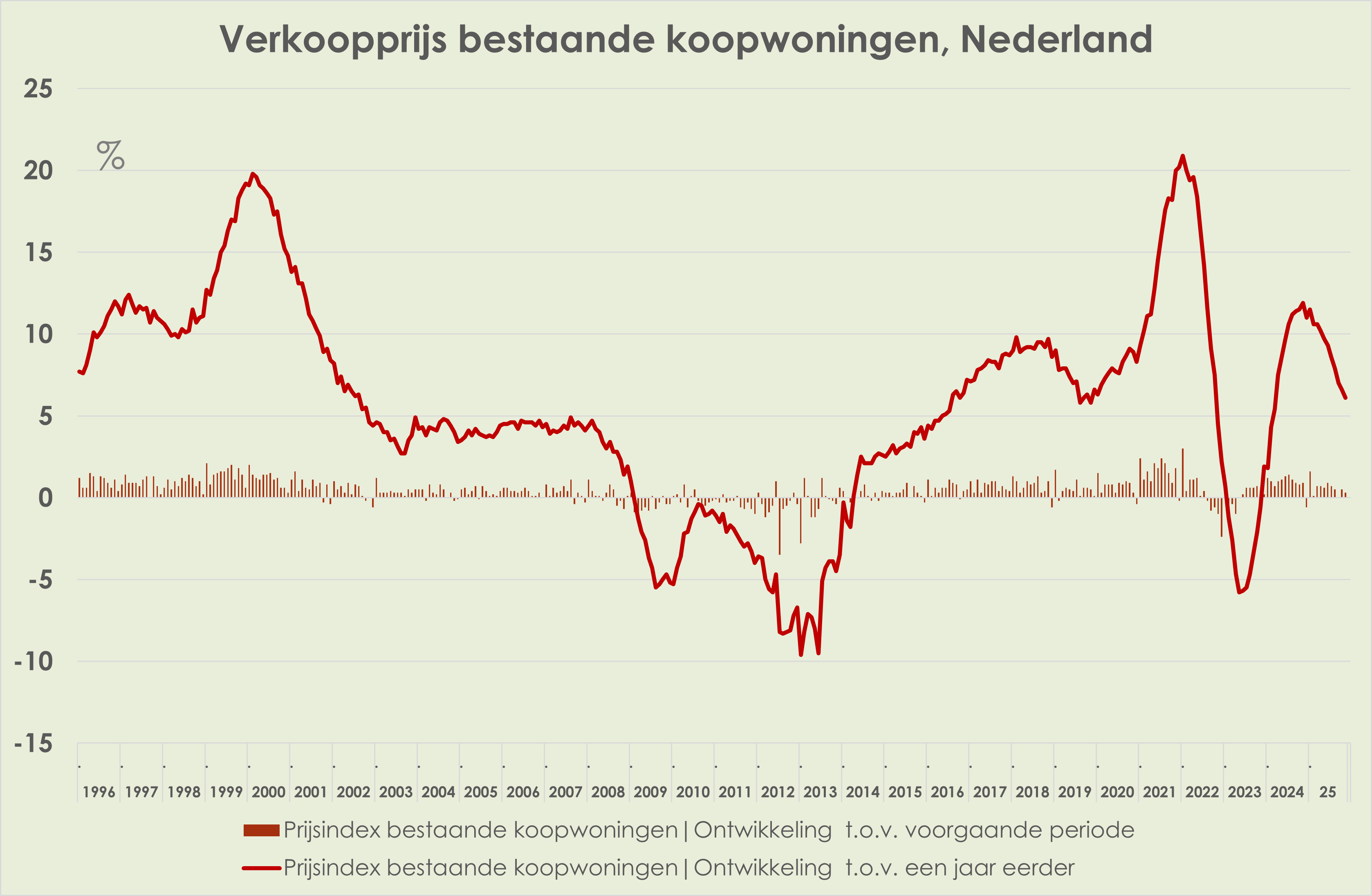 54. De huizenprijsstijging (verkoopprijzen bestaande woningen) is verder afgezwakt, van 6,6% t.o.v. een jaar eerder in oktober tot 6,1% in november, laagste sinds maart 2024; in november 2024 was de recente piek op 11,9%; maand-op-maand stegen de prijzen in november met 0,3%, na een stijging van 0,5% in oktober en een stijging van 0,9% in november 2024; de maandcijfers zijn niet voor het seizoen gecorrigeerd (zie grafiek hieronder); het aantal verkochte woningen was in november 1,4% hoger dan een jaar eerder; het 12-maandsgemiddelde van het aantal verkochte woningen stijgt sinds januari 2024 en was in november 2025 16,4% hoger dan een jaar eerder (zie grafiek hieronder) (link)