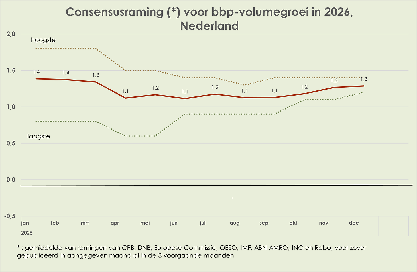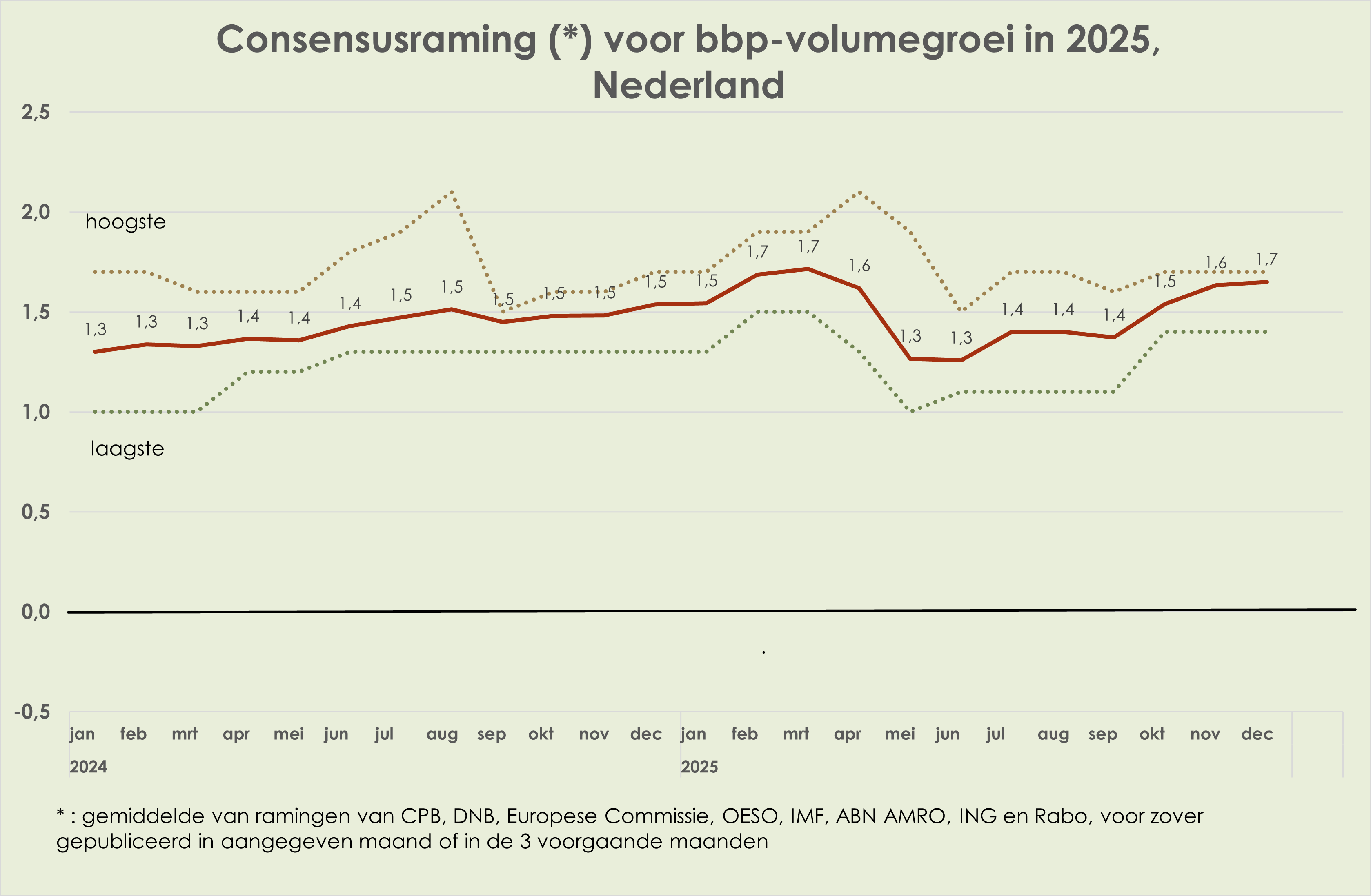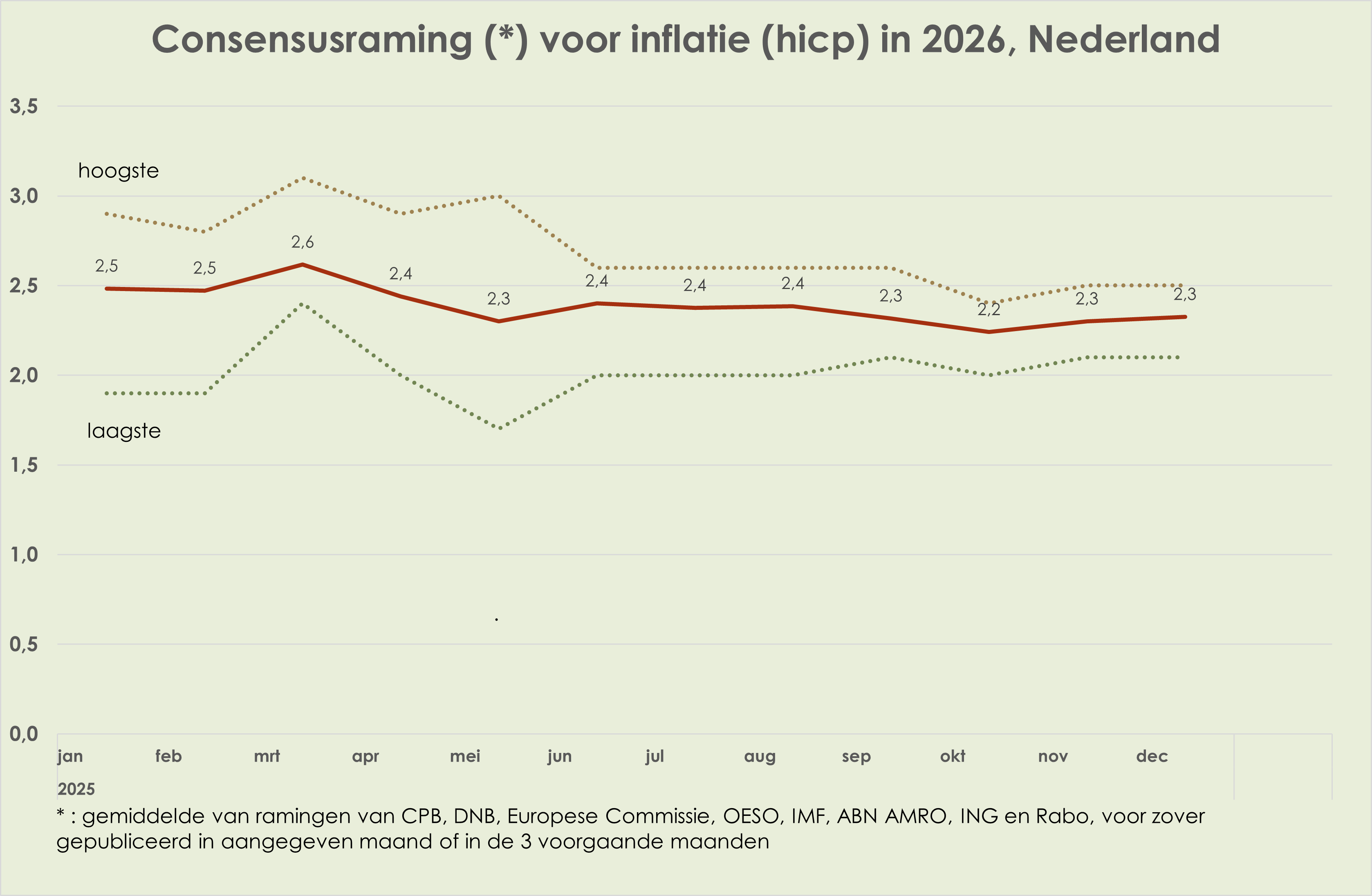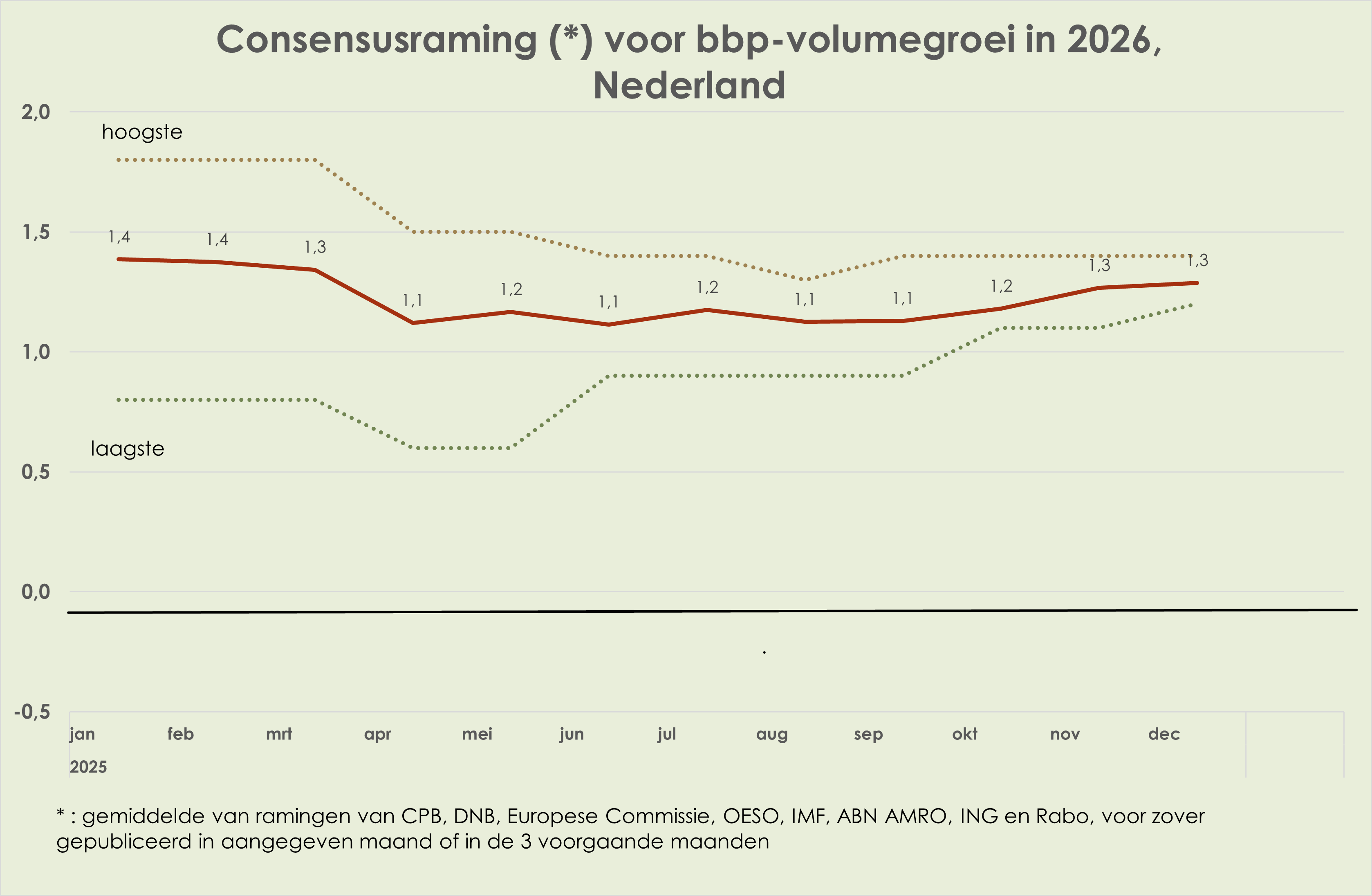 58. In de loop van 2025 waren de ramingen voor de bbp-volumegroei in 2025 en 2026 vrij stabiel; de consensusraming voor de bbp-volumegroei in 2025 was in december 0,2%-punt hoger dan een jaar eerder, waarmee de neerwaartse herziening in april-mei meer dan is goedgemaakt. In de loop van 2024 was de inflatieraming voor 2025 opwaarts herzien met 0,5%-punt en in de loop van 2025 kwam daar nog een opwaartse herziening van 0,2%-punt bij; in de loop van 2025 is de inflatieraming voor 2026 0,2%-punt neerwaarts herzien (deels door beperktere verhoging benzineaccijns op 1 januari 2026); in de loop van 2025 is de geraamde werkloosheid in 2025 per saldo niet herzien en is de raming voor 2026 marginaal (0,1%-punt) opwaarts herzien.