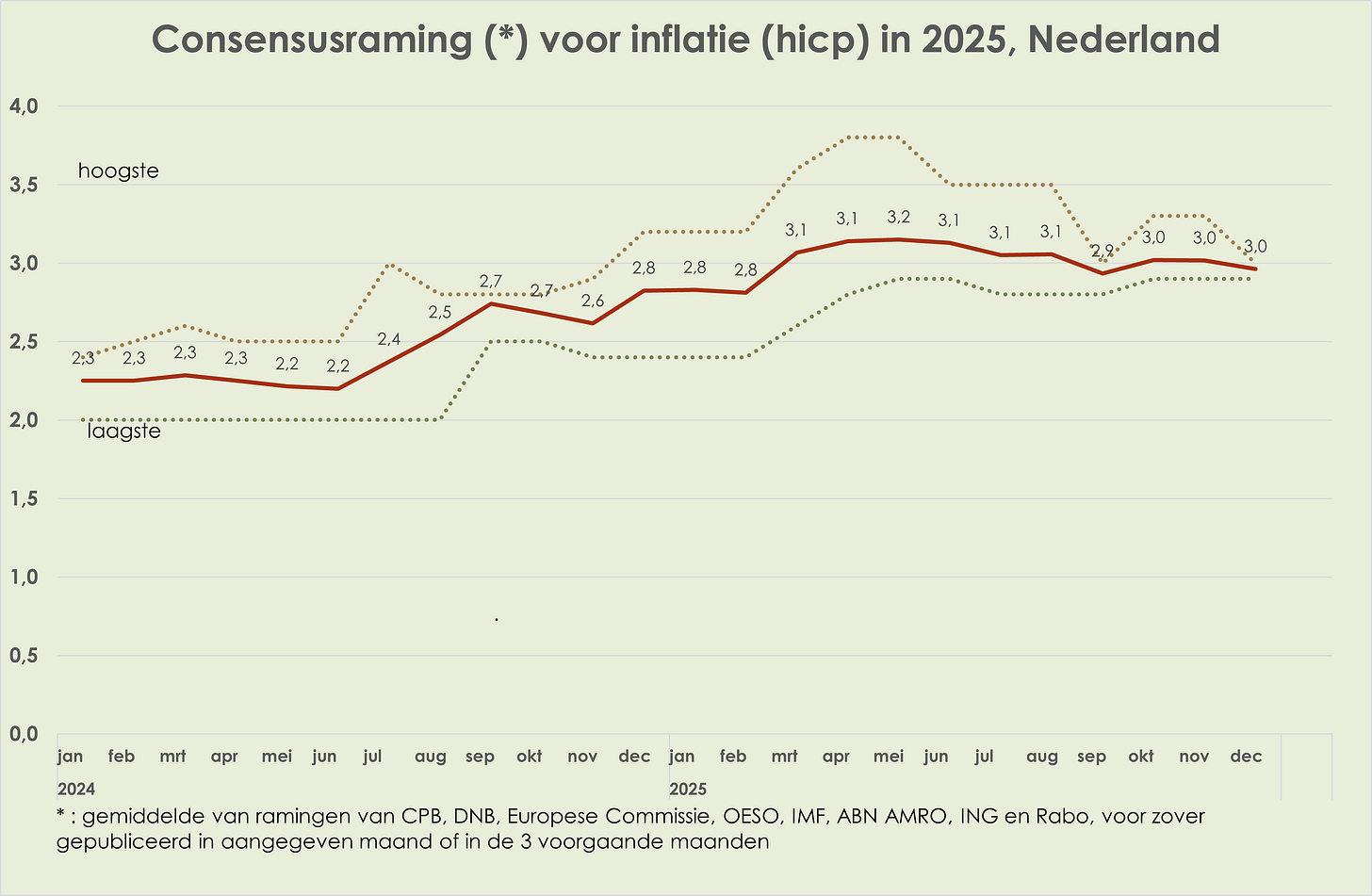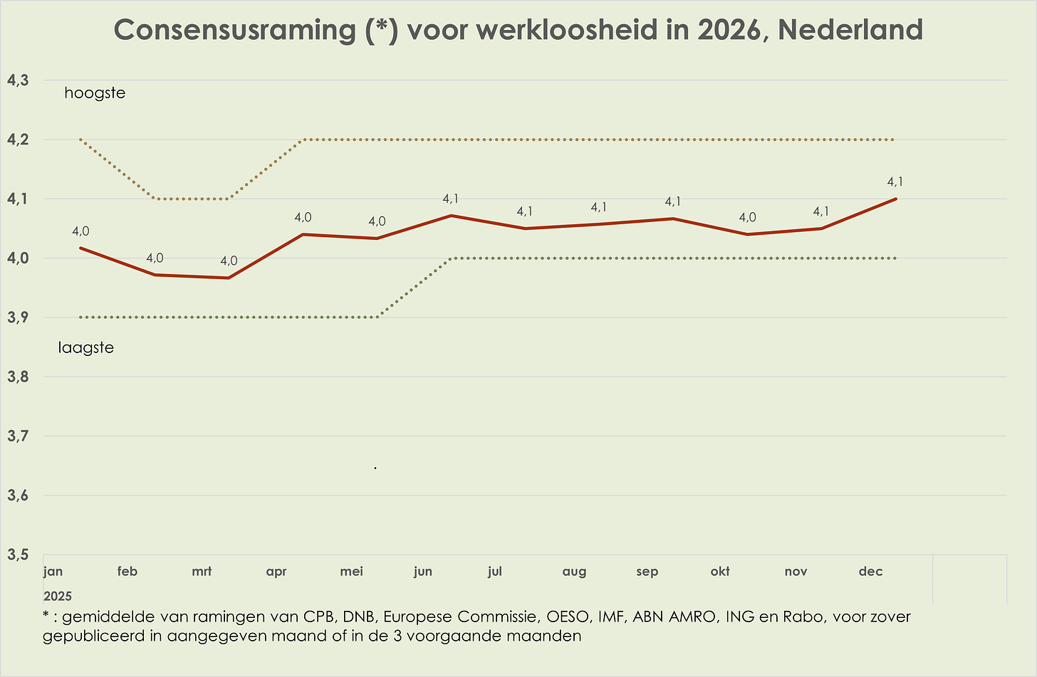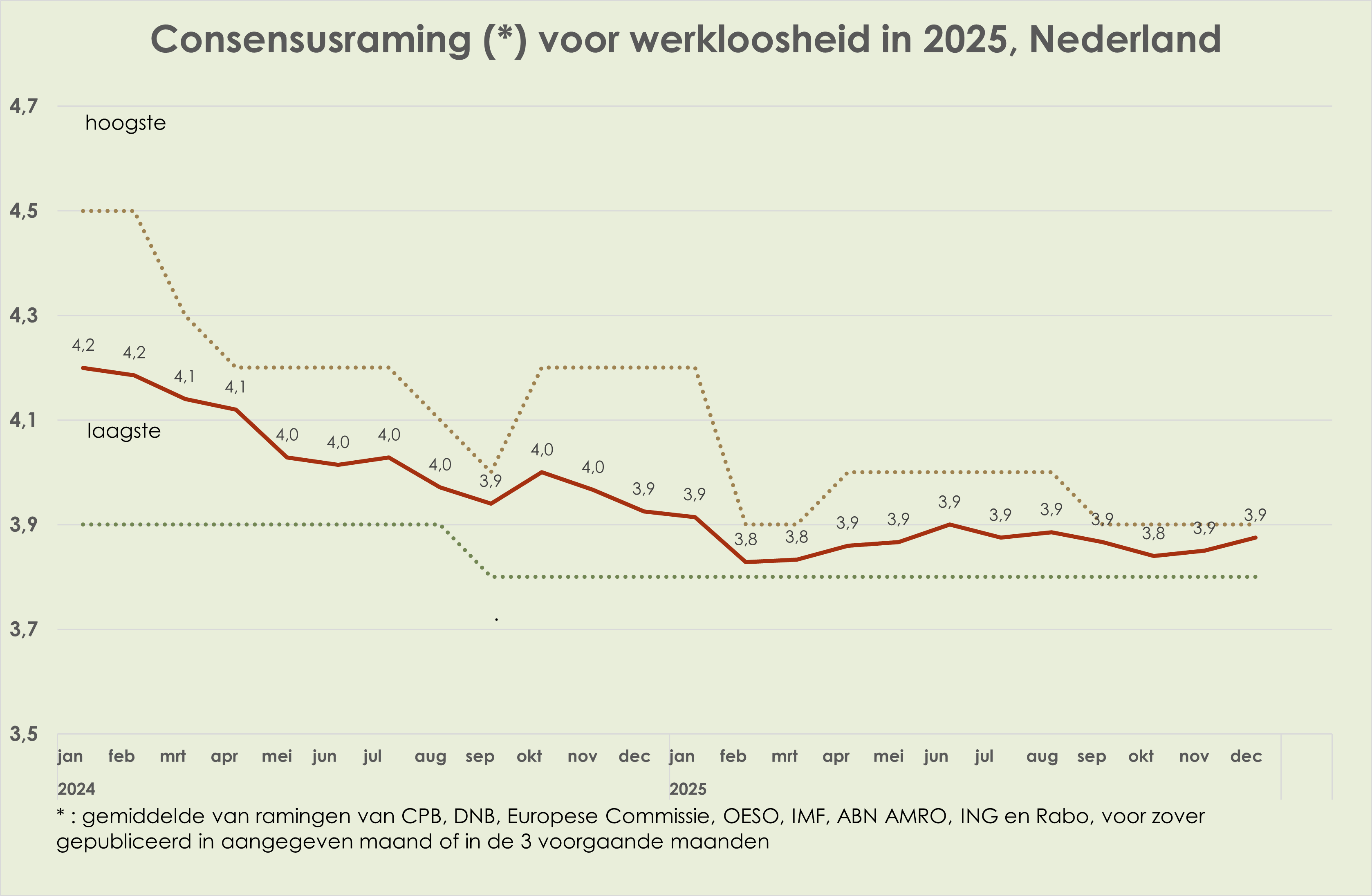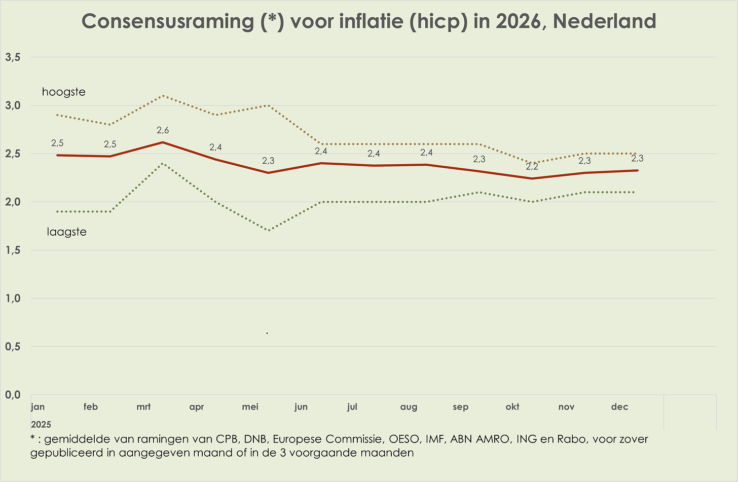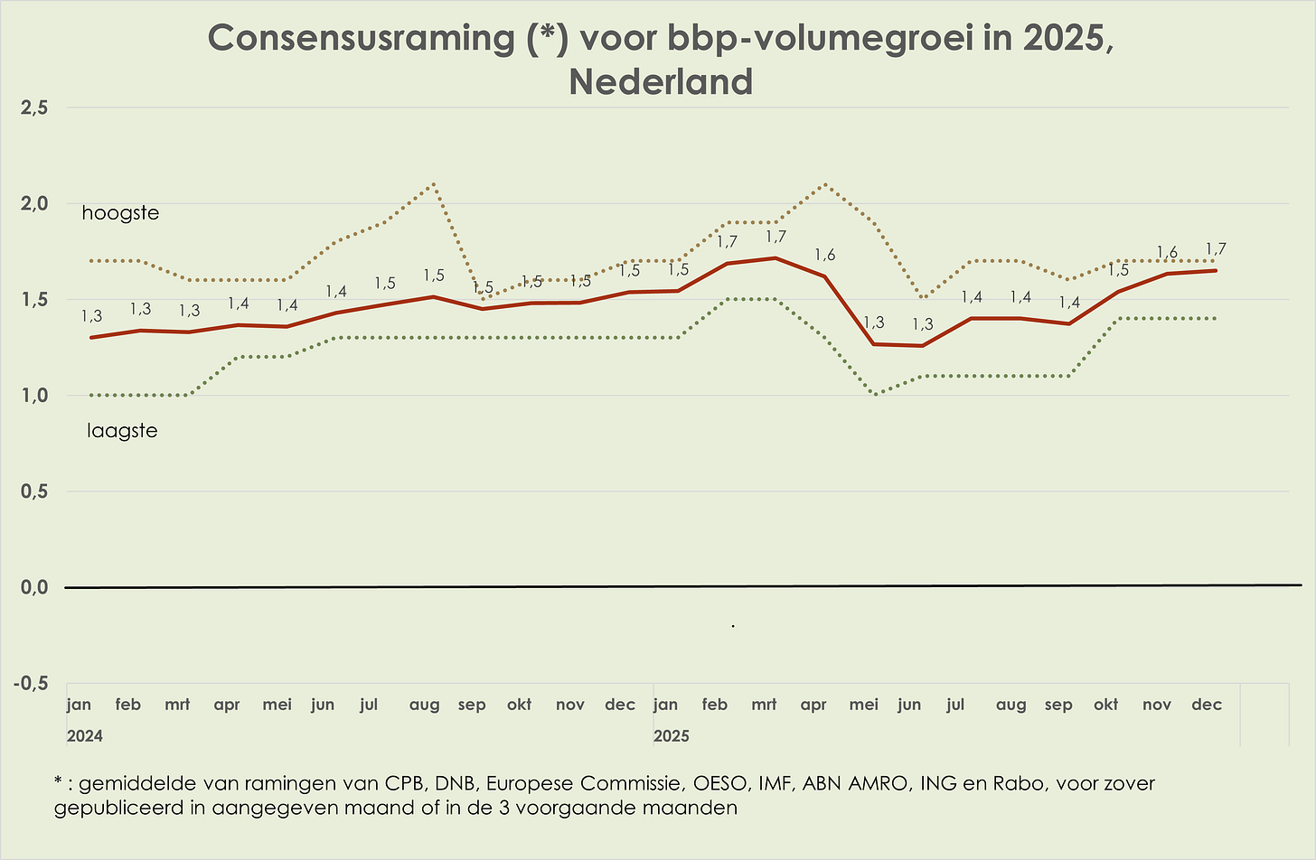 58. In de loop van 2025 waren de ramingen voor de bbp-volumegroei in 2025 en 2026 vrij stabiel; de consensusraming voor de bbp-volumegroei in 2025 was in december 0,2%-punt hoger dan een jaar eerder, waarmee de neerwaartse herziening in april-mei meer dan is goedgemaakt. In de loop van 2024 was de inflatieraming voor 2025 opwaarts herzien met 0,5%-punt en in de loop van 2025 kwam daar nog een opwaartse herziening van 0,2%-punt bij; in de loop van 2025 is de inflatieraming voor 2026 0,2%-punt neerwaarts herzien (deels door beperktere verhoging benzineaccijns op 1 januari 2026); in de loop van 2025 is de geraamde werkloosheid in 2025 per saldo niet herzien en is de raming voor 2026 marginaal (0,1%-punt) opwaarts herzien.