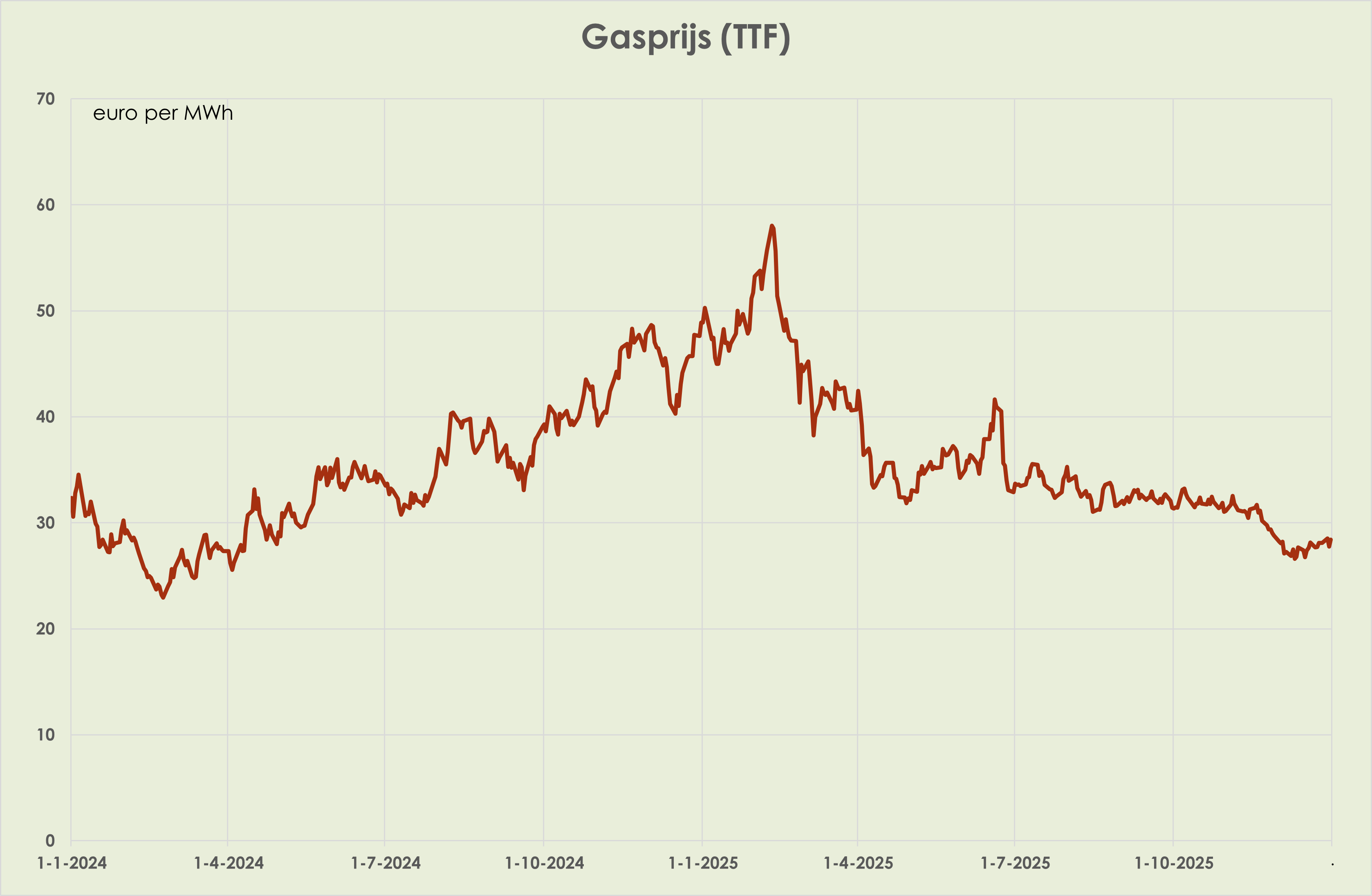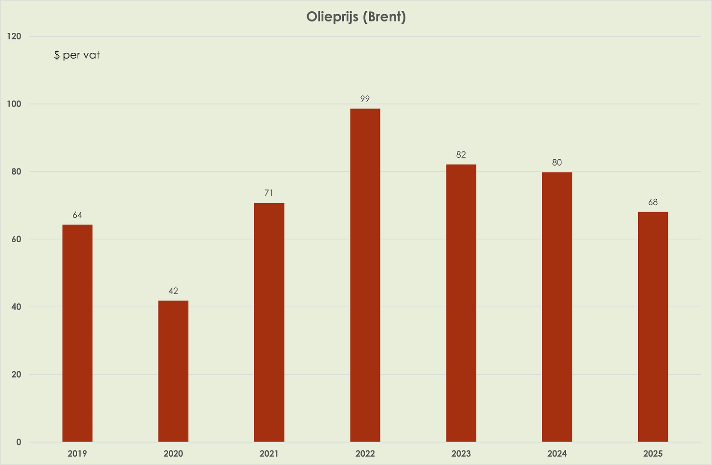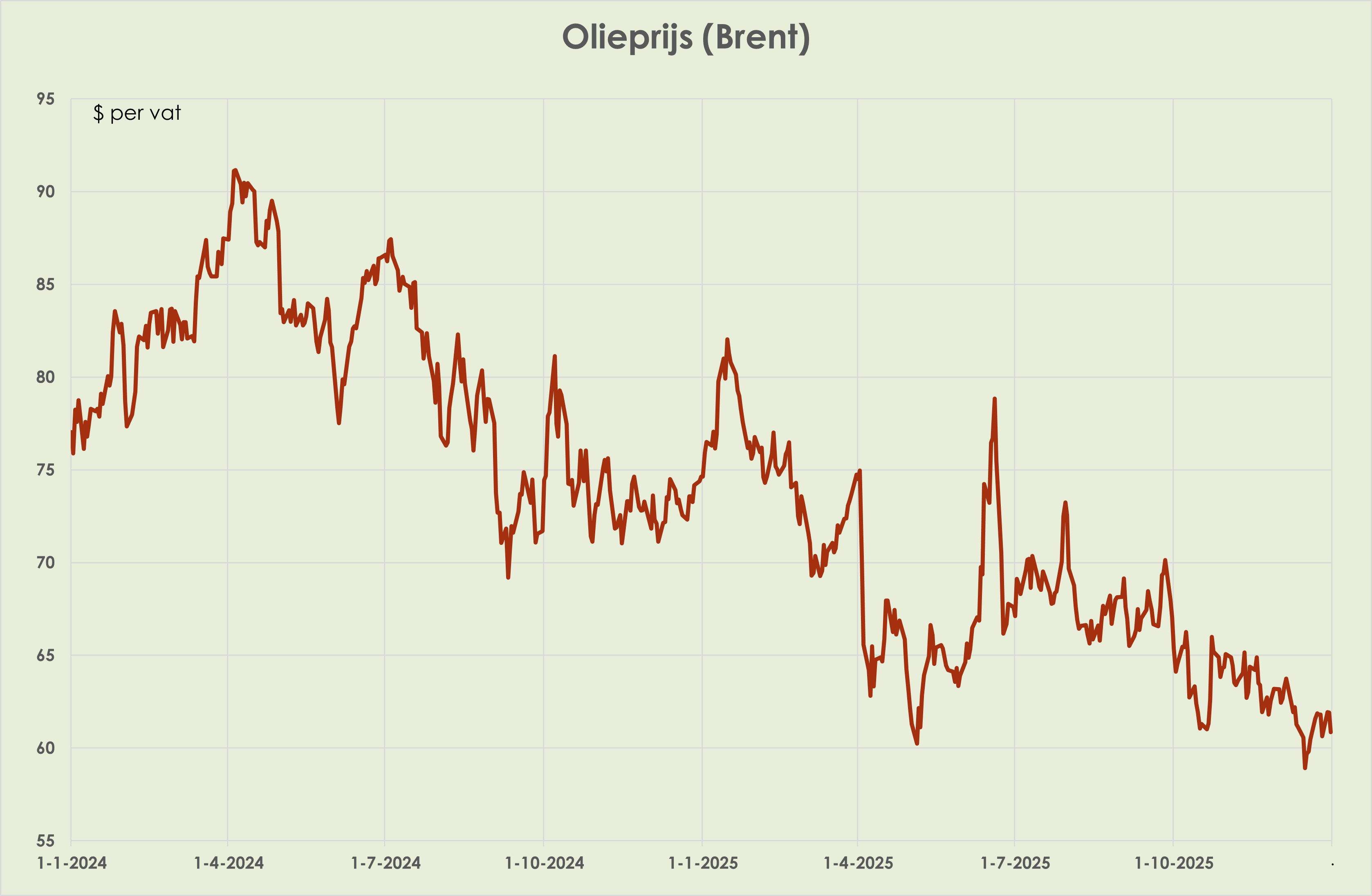 38. Eind 2025 was de olieprijs 18,5% lager dan eind 2024; de gemiddelde olieprijs in 2025 daalde tot 68 dollar per vat, laagste sinds 2020. (zie grafiek hieronder). Eind 2025 was de gasprijs 41,9% lager dan een jaar eerder; desalniettemin was de gemiddelde gasprijs in 2025, van 36 euro per MWh, 5% hoger dan gemiddeld in het voorgaand jaar. (zie grafiek hieronder)