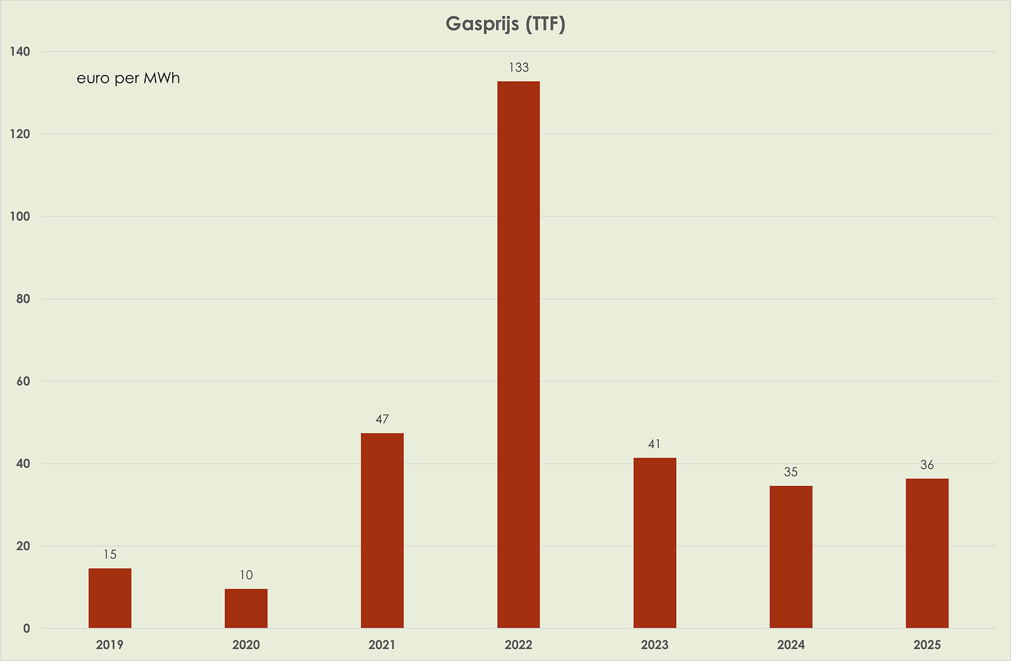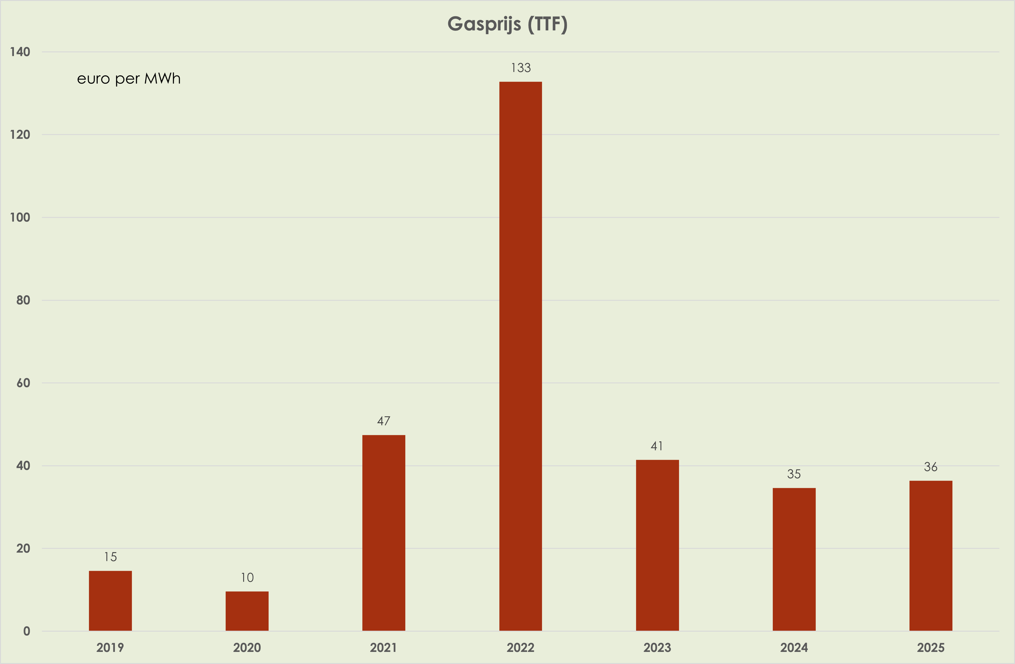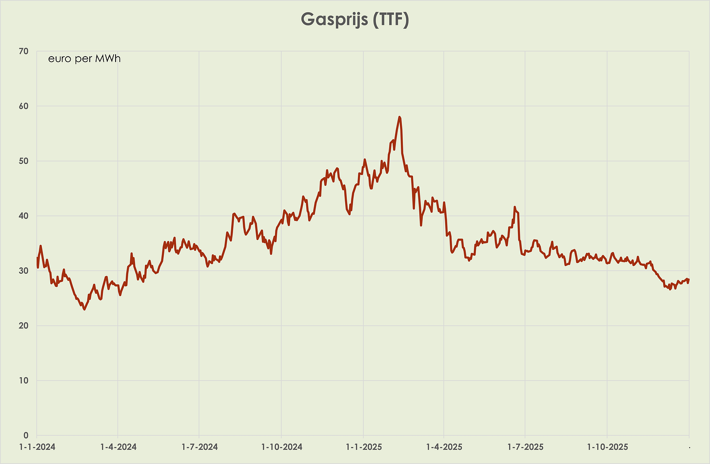 38. Eind 2025 was de olieprijs 18,5% lager dan eind 2024; de gemiddelde olieprijs in 2025 daalde tot 68 dollar per vat, laagste sinds 2020. (zie grafiek hieronder). Eind 2025 was de gasprijs 41,9% lager dan een jaar eerder; desalniettemin was de gemiddelde gasprijs in 2025, van 36 euro per MWh, 5% hoger dan gemiddeld in het voorgaand jaar. (zie grafiek hieronder)