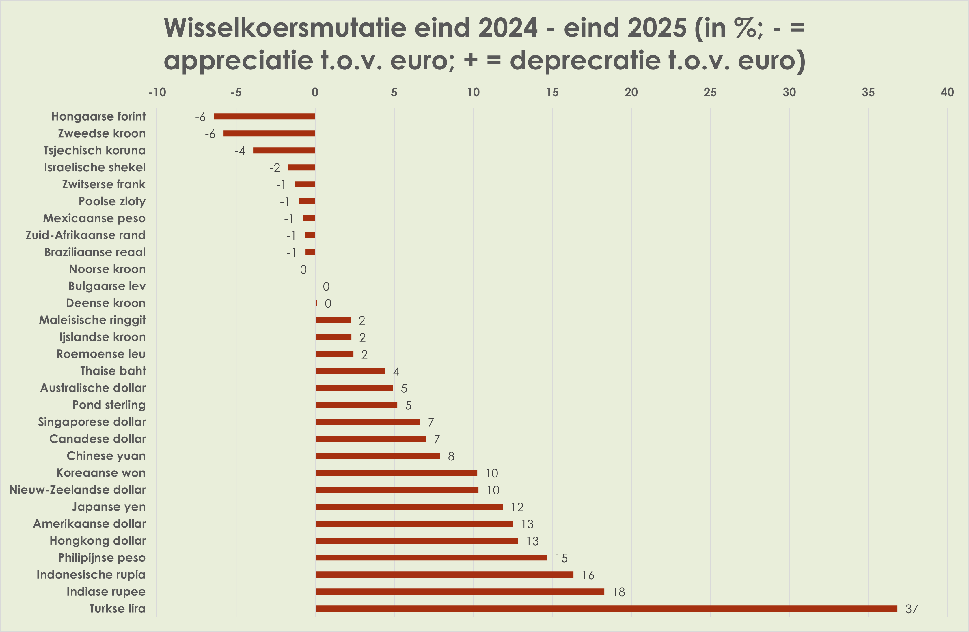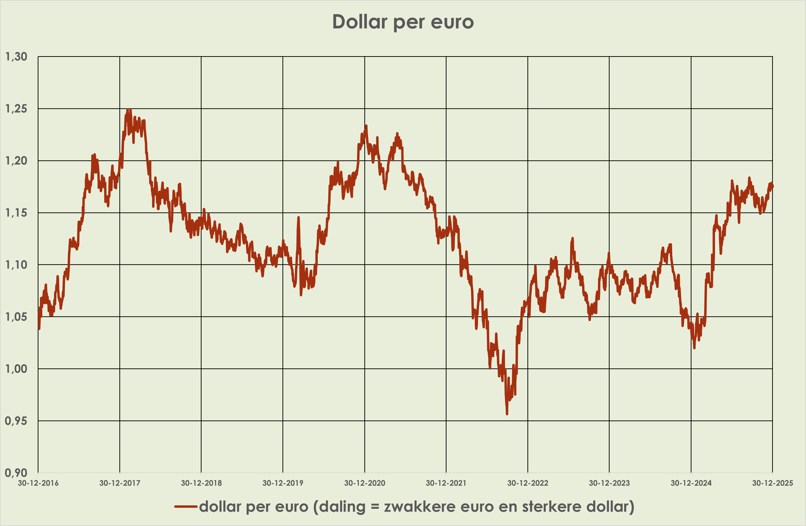 41. Wisselkoersen: in 2025 deprecieerde de Amerikaanse dollar 12,5% t.o.v. de euro, tot 1,18 dollar per euro, de zwakste dollarkoers sinds september 2021; de depreciatie vond vooral plaats in de eerste helft van 2025. De euro apprecieerde niet alleen sterk t.o.v. de dollar, maar ook t.o.v. yen en apprecieerde t.o.v. de Chinese yuan. (zie grafieken hieronder)