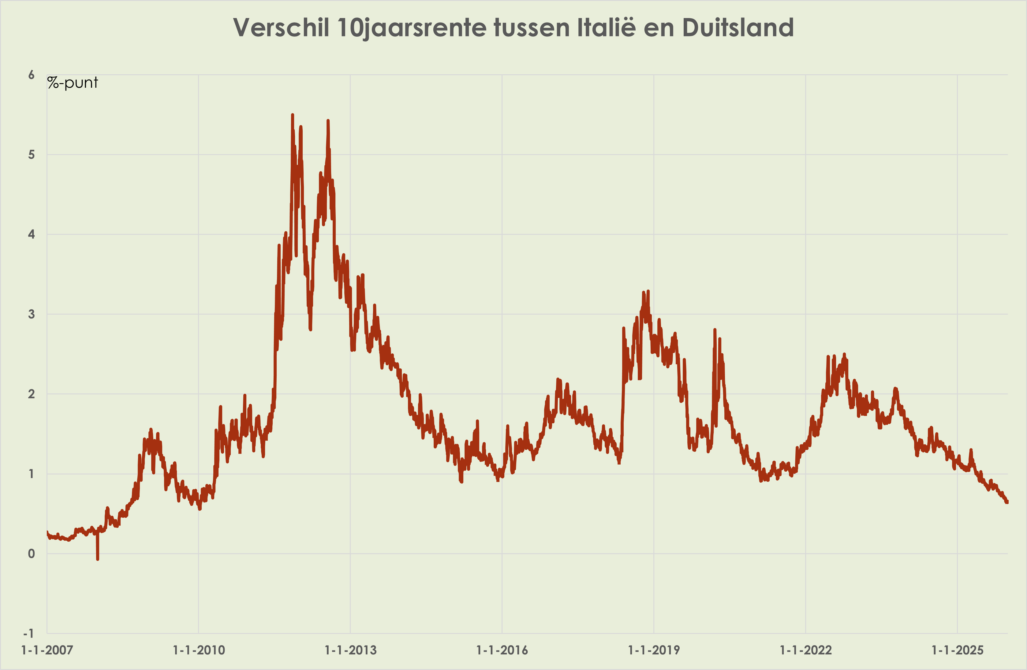 35. In het eurogebied nam de Duitse rente het sterkst toe (0,5%-punt) en de Spaanse rente het minst (0,2%-punt); de Italiaanse rente was zelfs ongewijzigd; hierdoor namen de rentedifferentiëlen met Duitsland af; het Italiaans-Duitse rentedifferentieel was eind 2025 het laagste sinds 2010 en de Italiaanse rente kwam onder de Franse rente te liggen (zie grafieken hieronder). (link)