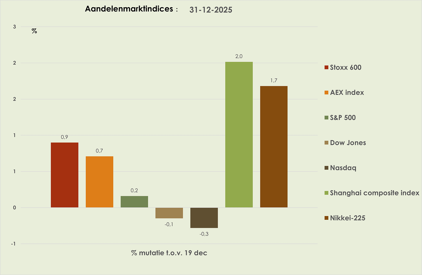 30. Aandelenmarkten: in de anderhalve week tot oudjaar waren er duidelijke stijgingen in Azië (Shanghai +2,0%; Nikkei +1,7%), beperkte stijgingen in Europa (Stoxx600 +0,9%, goed voor een nieuw all-time-high) en marginale mutaties in de VS. (zie grafiek hieronder).