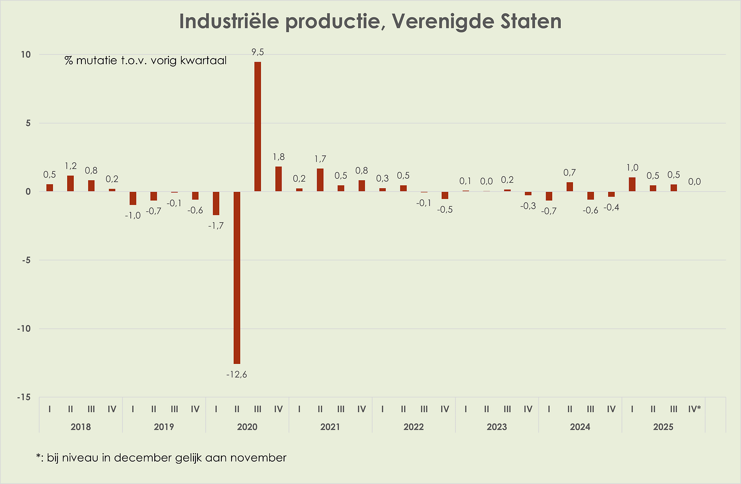 21. VS: de industriële productie is in november gestegen met 0,2% t.o.v. de voorgaande maand, na een daling van 0,1% in oktober; acquis voor het 4e kwartaal is nulgroei t.o.v. het voorgaand kwartaal, na een stijging van 0,5% in het 3e kwartaal (zie grafiek hieronder) (link)