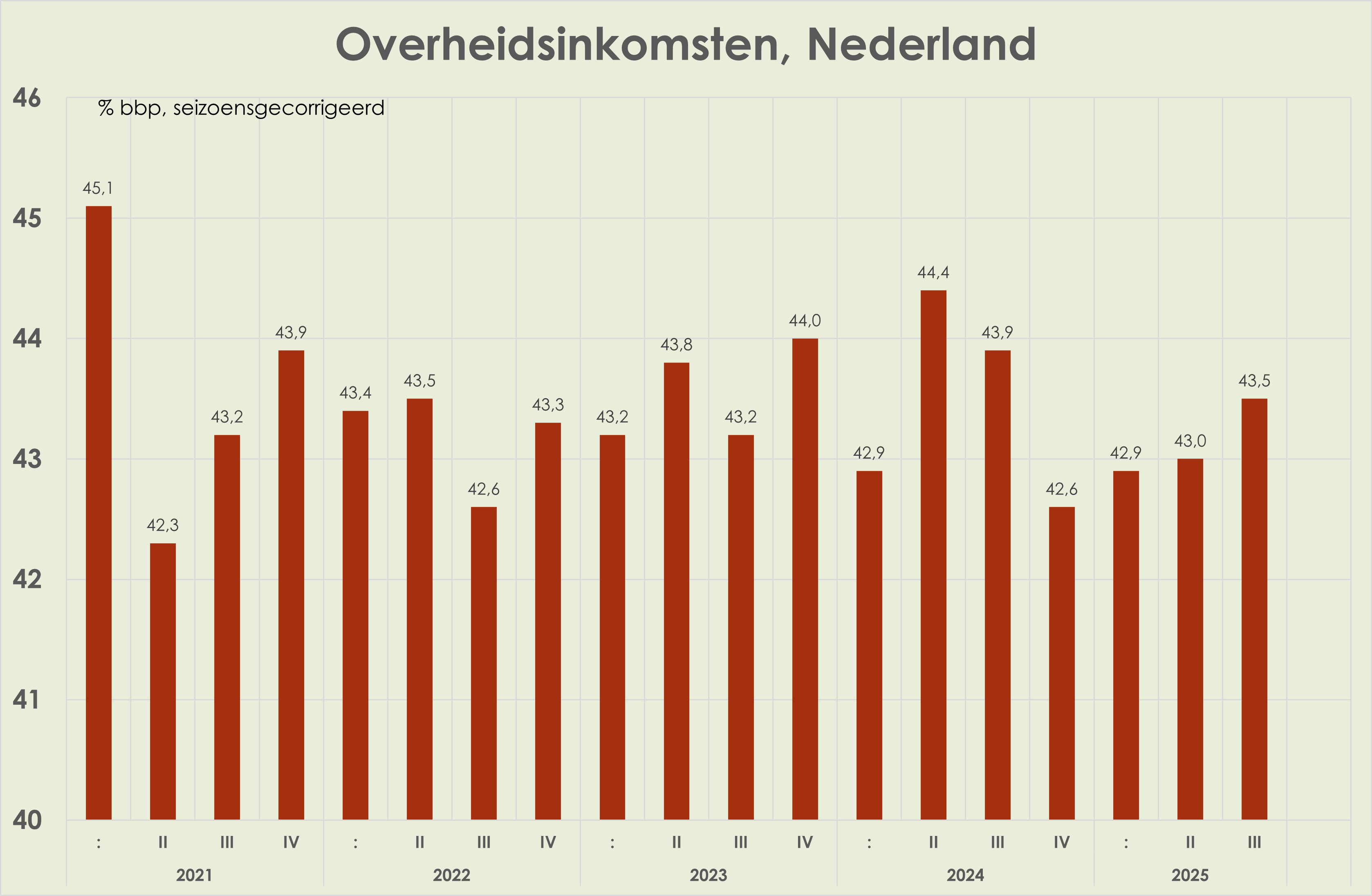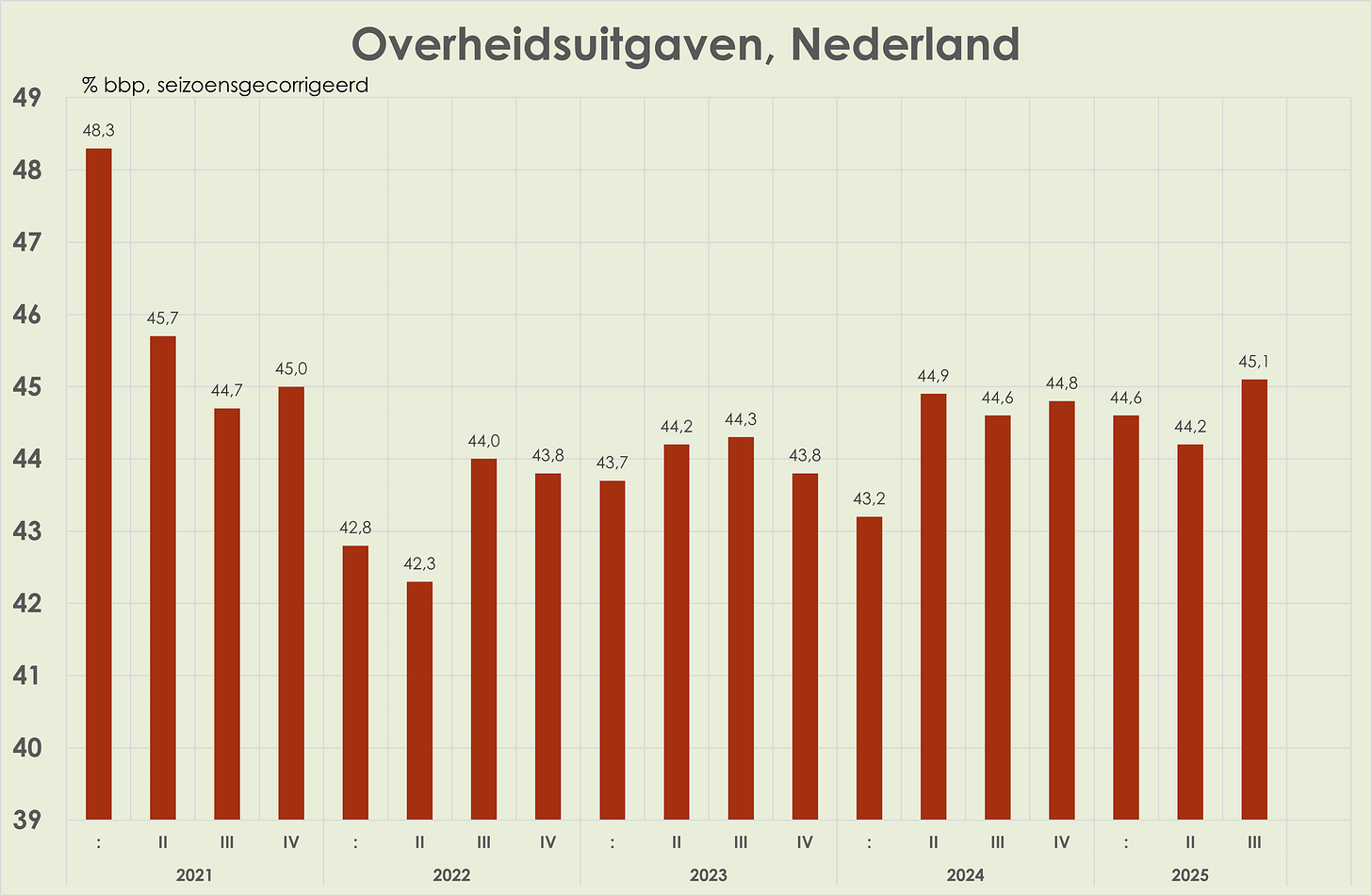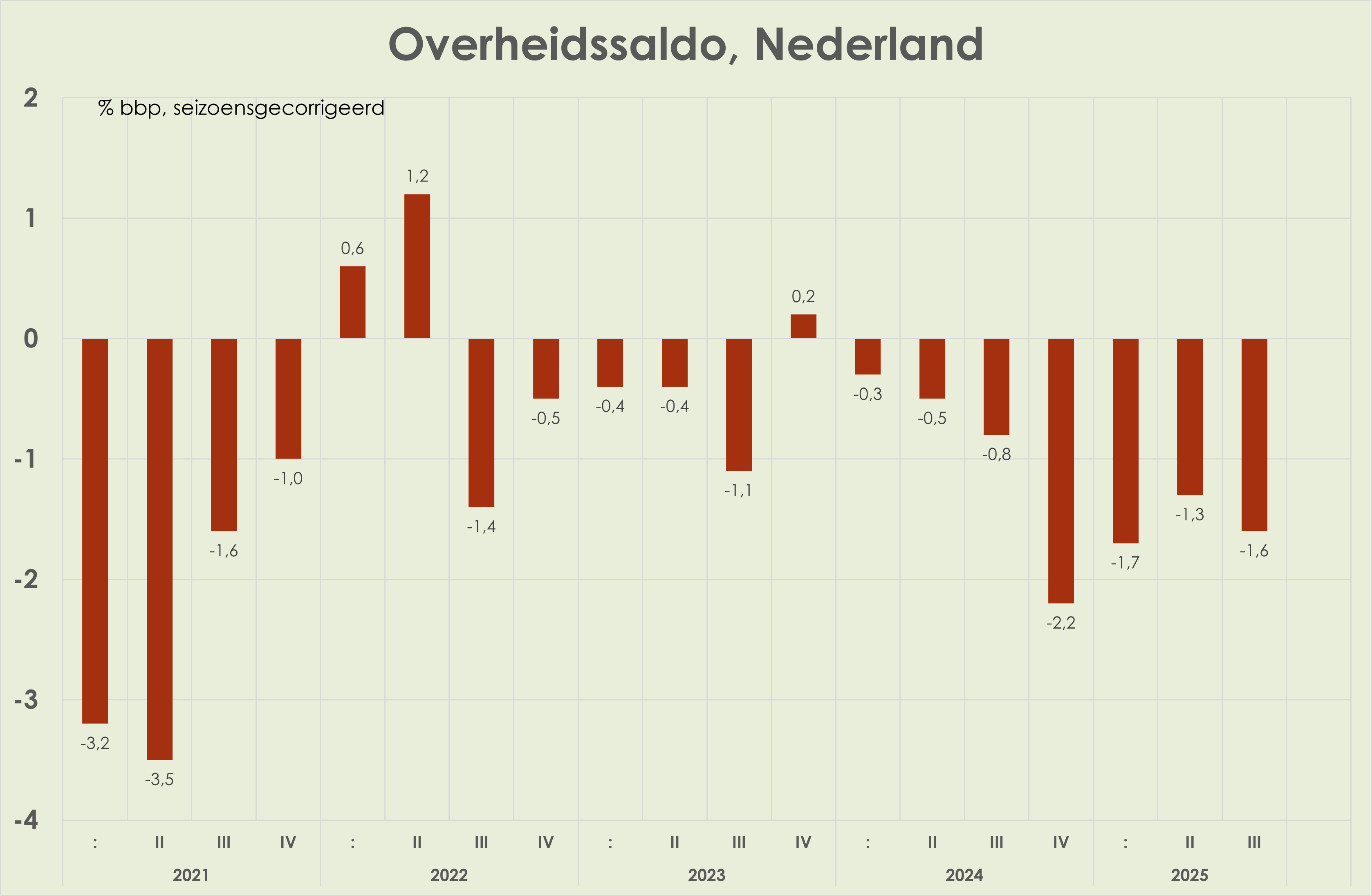 59. Het overheidstekort (gecorrigeerd voor seizoen) is opgelopen van 1,3% bbp in het 2e kwartaal tot 1,6% bbp in het 3e kwartaal; acquis voor het tekort in 2025 is 1,6% bbp, een stijging t.o.v. het tekort in 2024 van 0,9% bbp en een fractie onder het tekort in 2025 geraamd in de Najaarsnota van 1,8% bbp. (zie grafiek hieronder) (link)