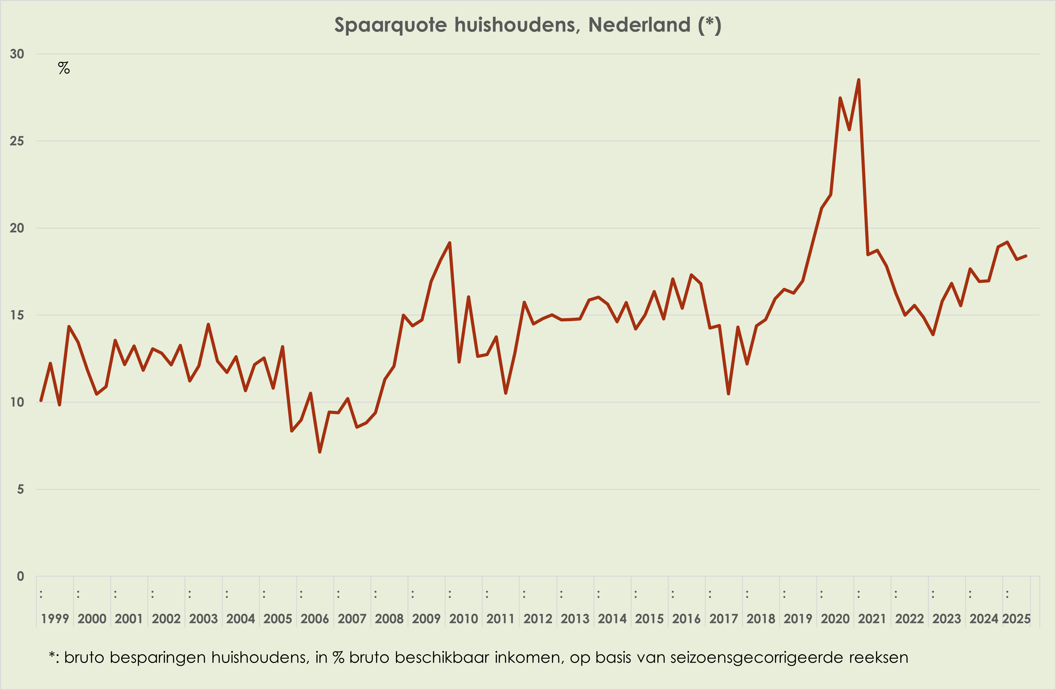 51. De spaarquote van huishoudens is marginaal gestegen, van 18,2% van het beschikbaar inkomen in het 2e kwartaal tot 18,4% in het 3e kwartaal, 3,9%-punt boven het gemiddelde sinds 1999 (zie grafiek hieronder).