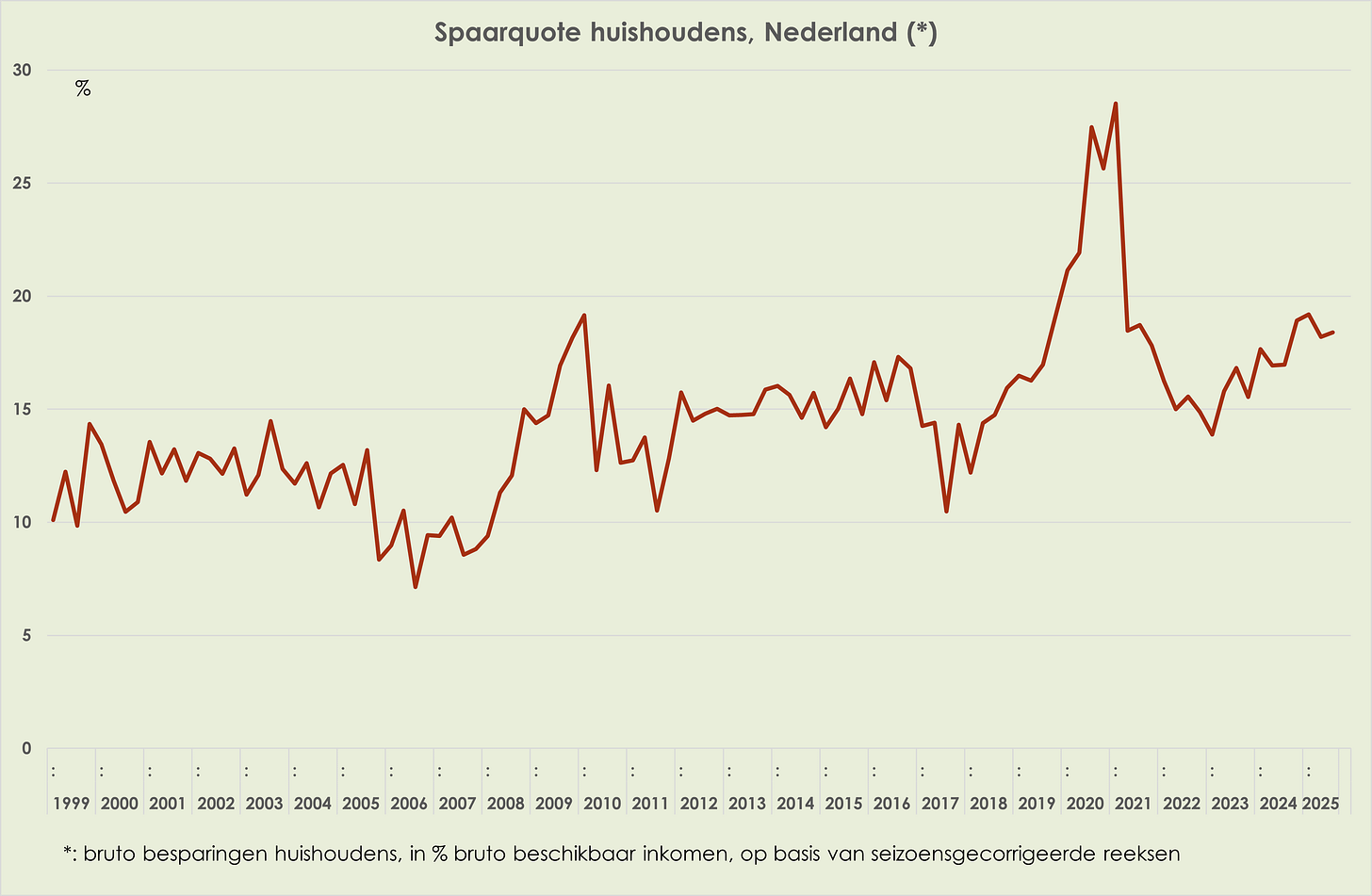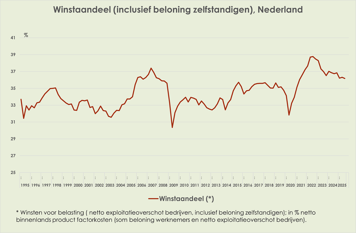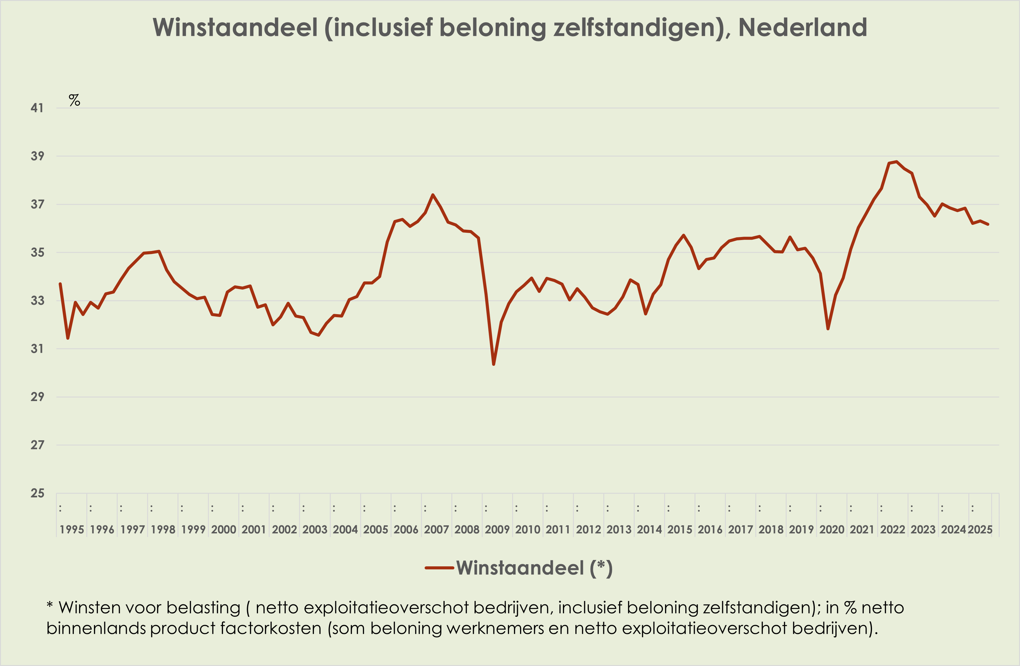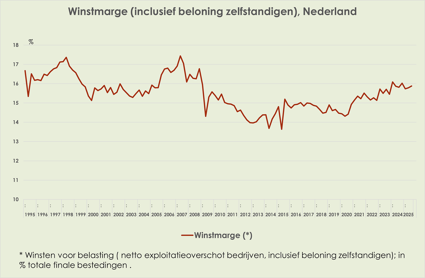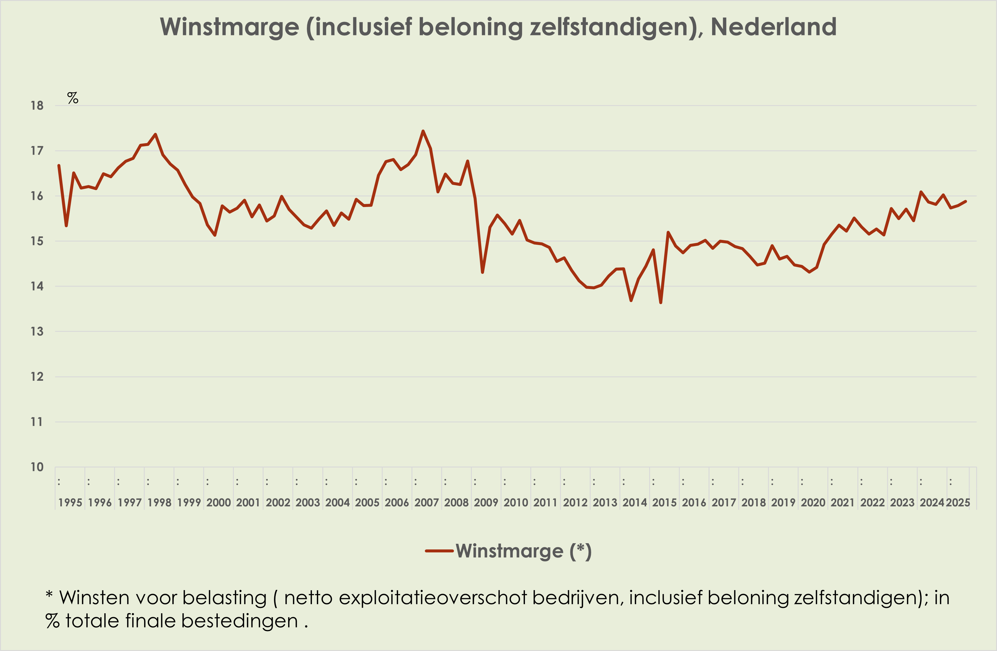 48. De winstmarge is marginaal opgelopen van 15,8% in het 2e kwartaal tot 15,9% in het 3e kwartaal van 2025, hoogste sinds het 4e kwartaal van 2024, 0,3%-punt onder de piek in het 1e kwartaal van 2024 en 0,4%-punt boven het gemiddelde sinds 1995 (zie grafiek hieronder) (link)