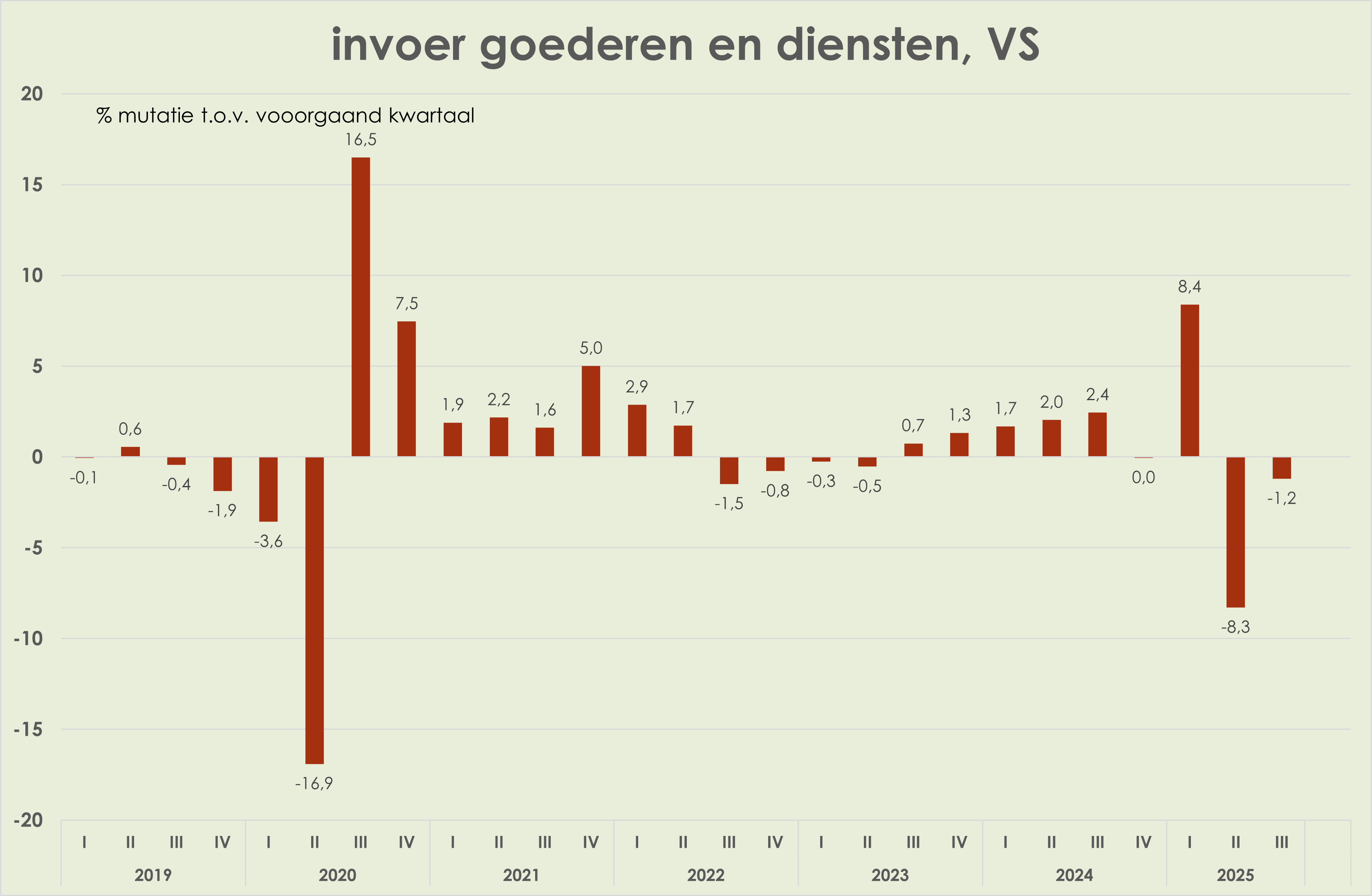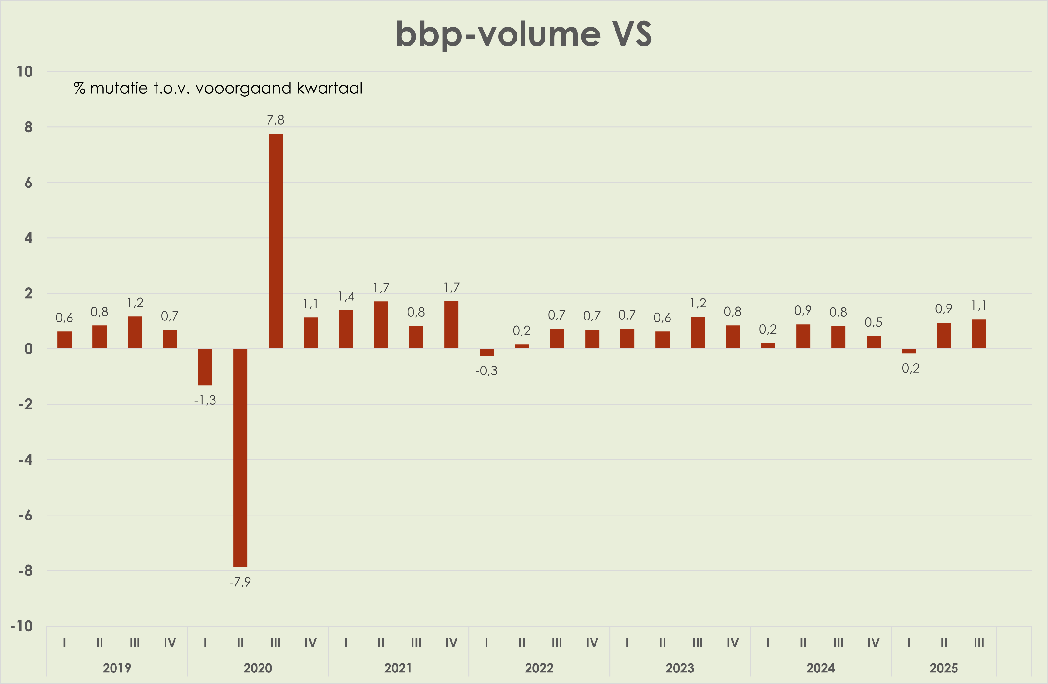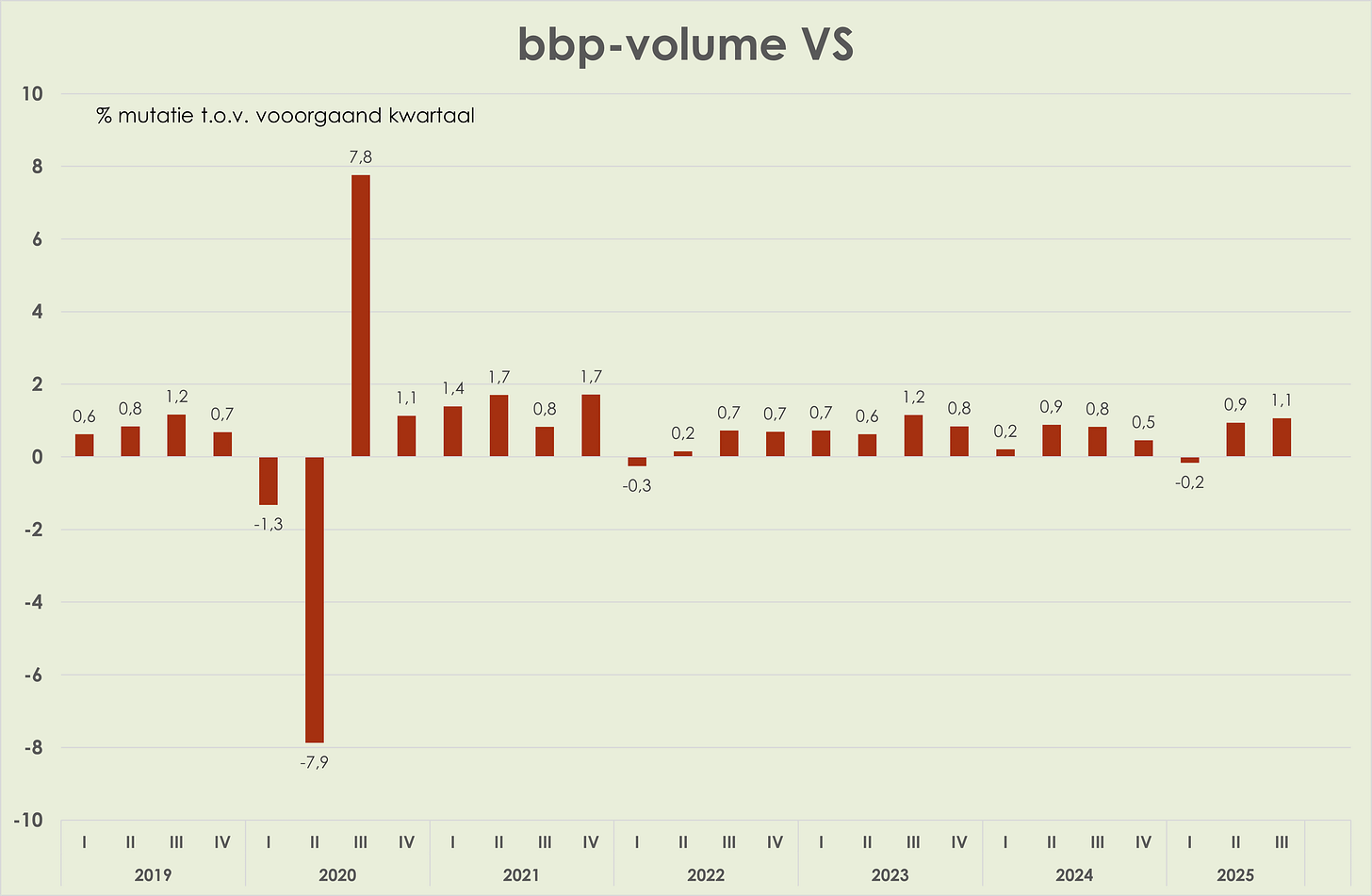 20. VS: de bbp-volumegroei is opgelopen van 0,9% t.o.v. het voorgaand kwartaal in het 2e kwartaal tot 1,1% in het 3e kwartaal, sterkste groei sinds het 3e kwartaal van 2023 (geannualiseerd liep de groei op van 3,8% naar 4,3%). In het 3e kwartaal trok de groei van de particuliere consumptie en de uitvoer aan, was de investeringsgroei zwak en waren de heftige schommelingen in de invoer voorbij. (link) (link) (link)