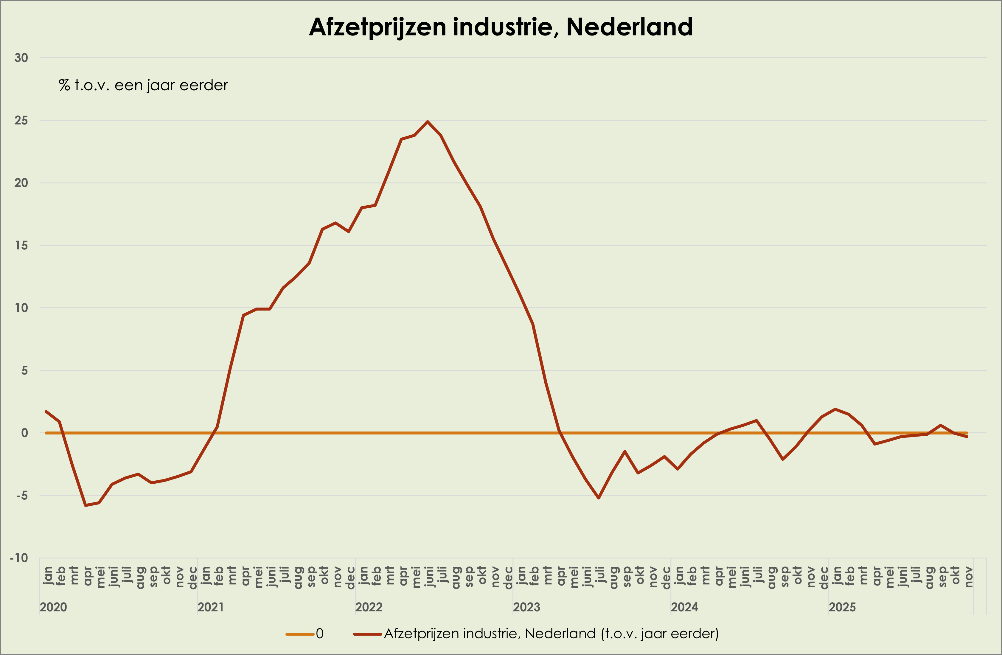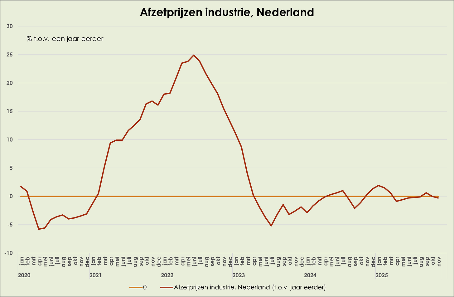 55. De afzetprijzen van de industrie zijn in november gedaald met 0,3% t.o.v. een jaar eerder, na stabiele prijzen in oktober; maand-op-maand stegen de prijzen 0,1% in november, na een daling van 0,4% in oktober. (zie grafiek hieronder) (link)