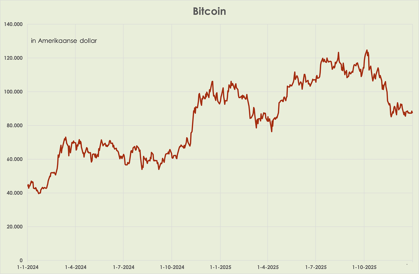 40. Bitcoin: de bitcoin daalde in de anderhalve week tot oudjaar 0,6%%, tot 29,8% onder de recordprijs begin oktober. Eind 2025 was de bitcoin 6,4% lager dan een jaar eerder, na een stijging van 122% in 2024 (zie grafiek hieronder)