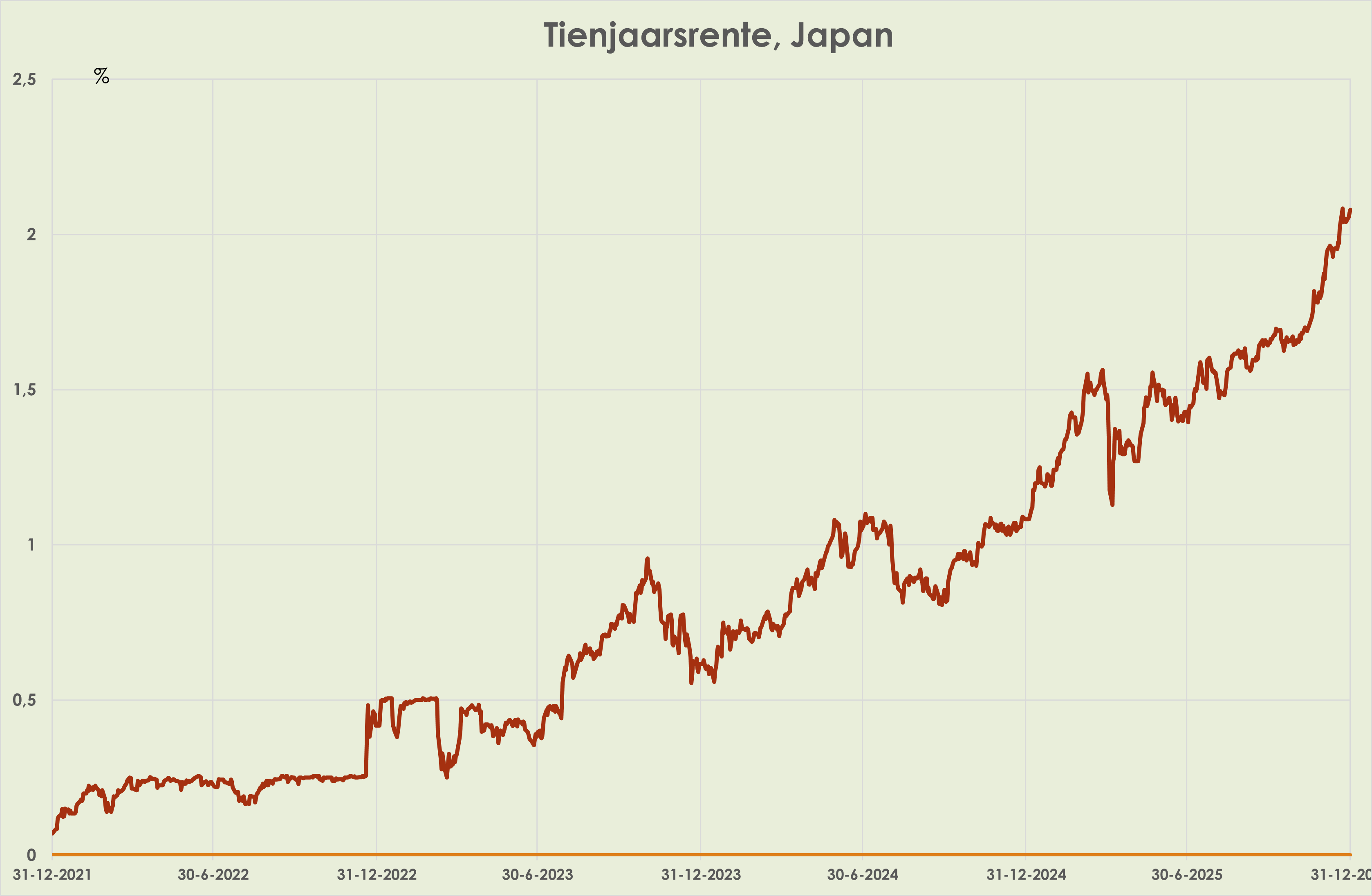 33. Obligaties: in de anderhalve week tot oudjaar waren de Duitse en Amerikaanse 10-jaarsrentes per saldo stabiel en steeg de Japanse 10-jaarsrente verder, met 0,1%-punt tot 2,1%, hoogste sinds 1993.
