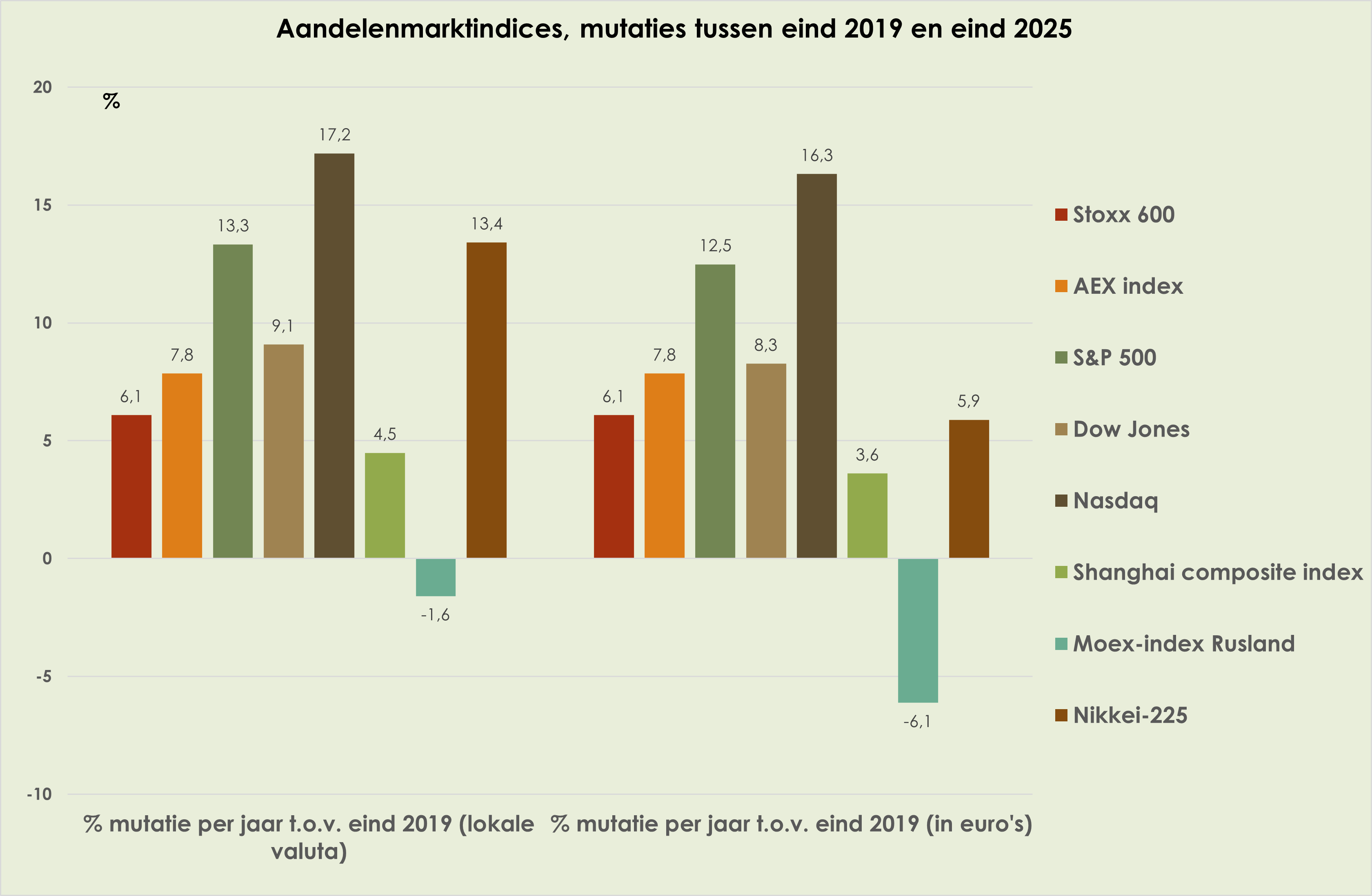 31. In 2025 namen de aandelenkoersen in lokale valuta het sterkst toe in Japan (Nikkei +26,2%) en was de stijging in Europa wat sterker dan in de VS (Stoxx600 +17,4% versus S&P500 +16,4%), maar met een sterkere stijging voor techbeurs Nasdaq (+20,4%); uitgedrukt in euro’s was de grootste stijging echter in Europa.