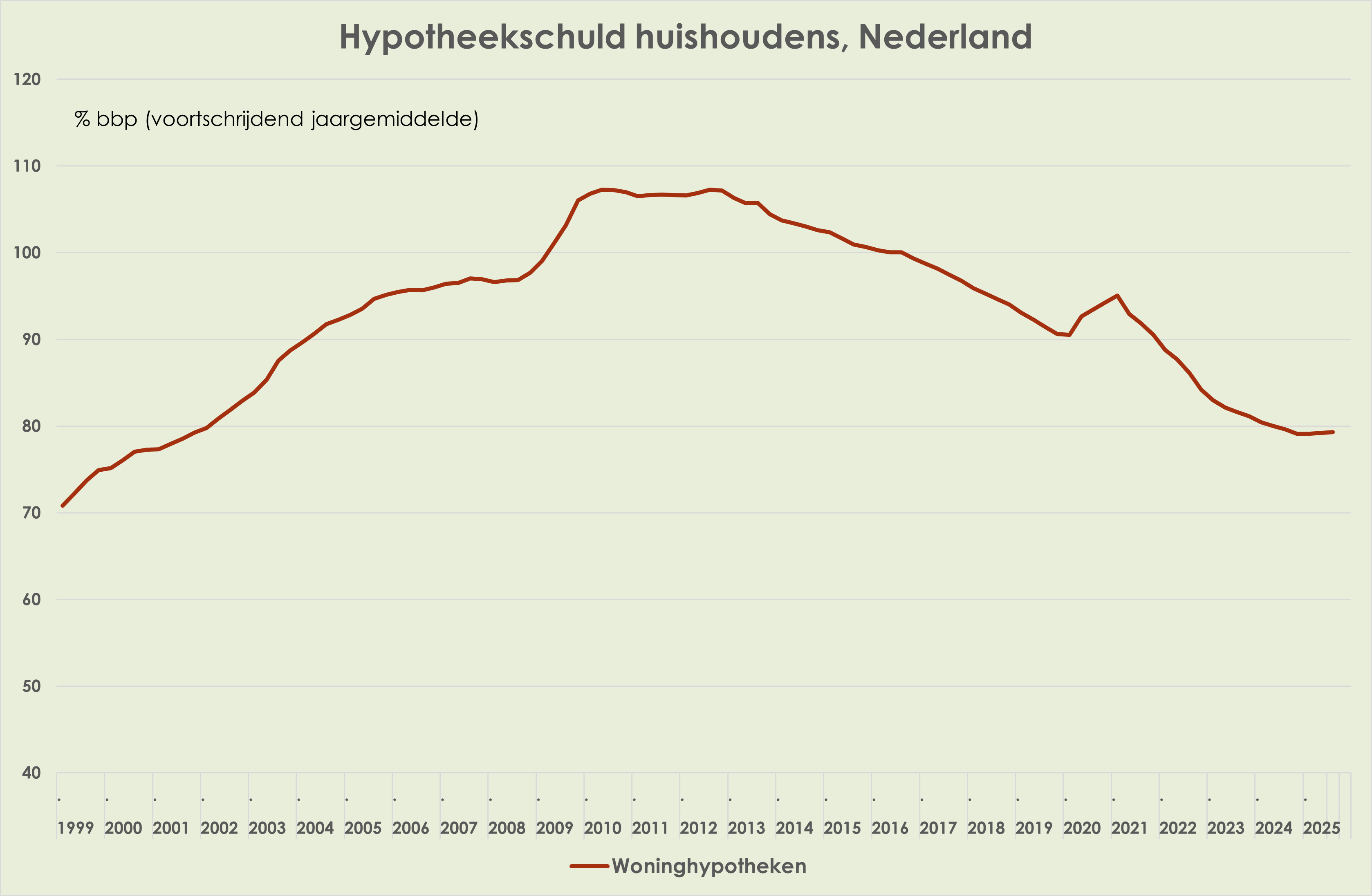 52. De hypotheekschuld van huishoudens, uitgedrukt in % bbp, is marginaal opgelopen van 79,2% in het 2e kwartaal tot 79,3% in het 3e kwartaal, tweede stijging sinds het 4e kwartaal van 2021 en 28,0%-punt onder de piek in het 3e kwartaal van 2012. (zie grafiek hieronder) (link)