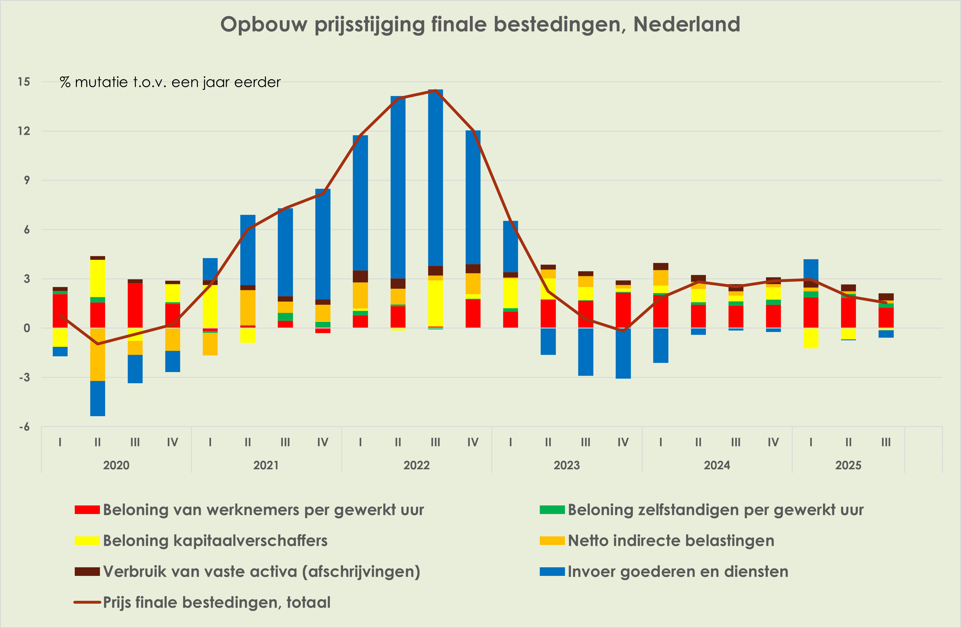 53. De prijsstijging van finale bestedingen is verder afgezwakt, van 1,9% t.o.v. een jaar eerder in het 2e kwartaal tot 1,5% in het 3e kwartaal, laagste sinds het 4e kwartaal van 2023; loonkosten per gewerkt uur leverden in het 3e kwartaal voor het 10e achtereenvolgende kwartaal de grootste bijdrage aan de prijsstijging (1,3%-punt); kapitaalkosten drukten de prijsstijging voor het derde achtereenvolgende kwartaal, in het 3e kwartaal met 0,1%-punt (zie grafiek hieronder)