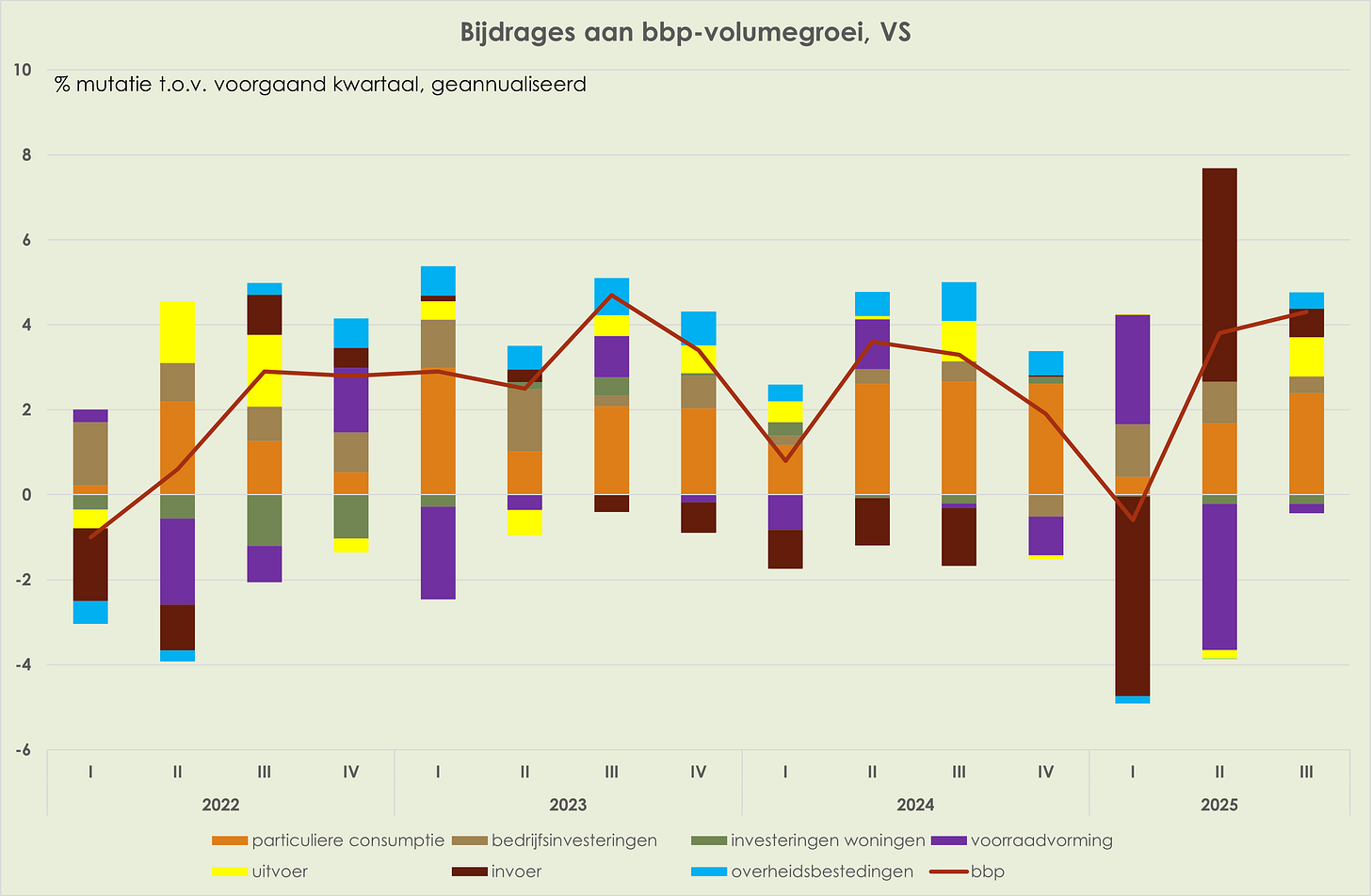 5. Internationaal was 2025 het jaar van de invoerheffingen. Uiteindelijk waren de verhogingen van de Amerikaanse heffingen zeer fors, maar niet zo fors als in april gepresenteerd. De EU besloot geen tegenmaatregelen te nemen. China deed dat wel en kwam ook met uitvoerrestricties voor aardmetalen. De economische effecten van de Amerikaanse invoerheffingen waren beperkter dan eerder verwacht, deels doordat de heffingen na april werden teruggeschroefd, deels door het grotendeels ontbreken van tegenmaatregelen, deels door de economische veerkracht en deels doordat Amerikaanse bedrijven de kostenverhoging door de invoertarieven nog niet volledig hebben doorberekend.
