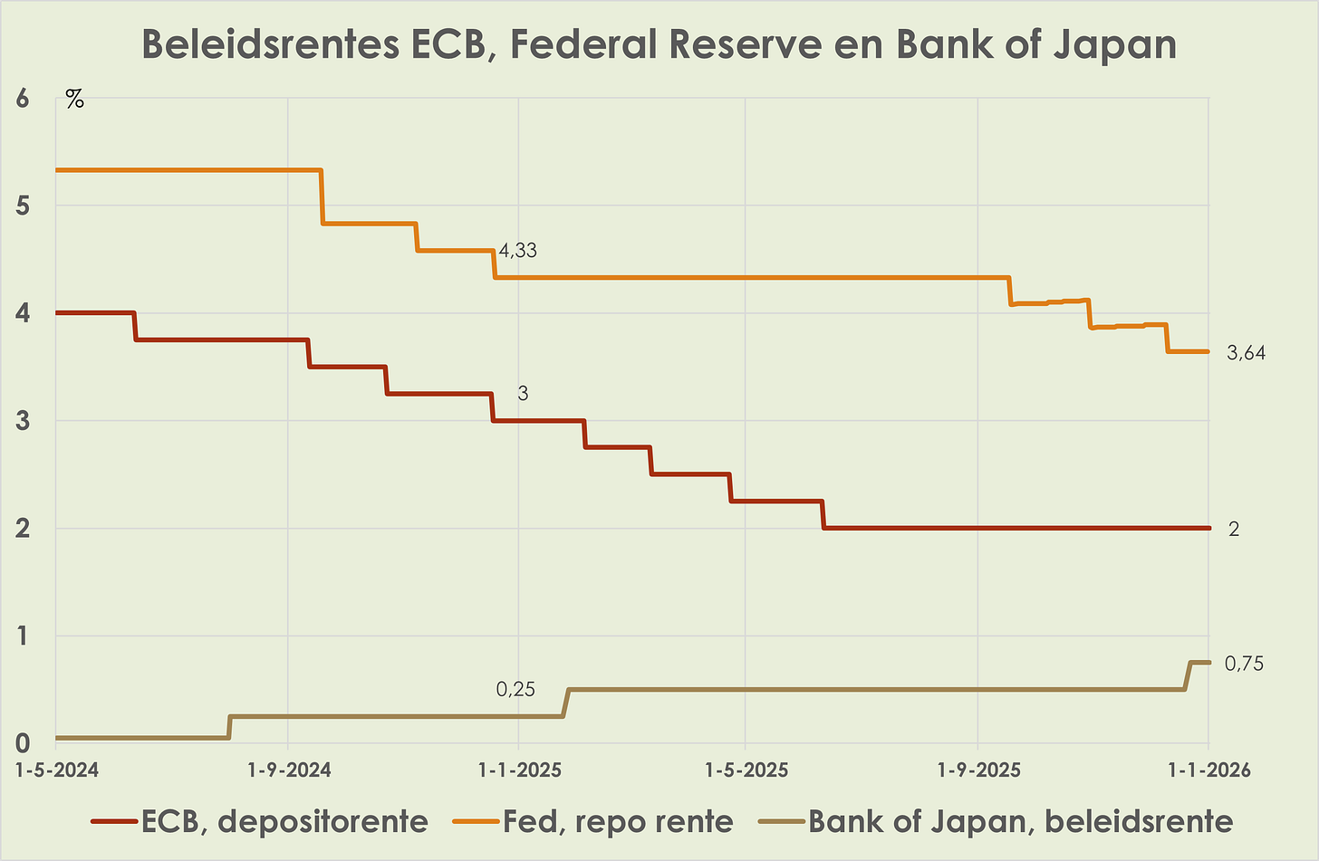 36. Beleidsrentes: In 2025 daalden de meeste beleidsrentes, in het eurogebied met 1%-punt en in de VS met 0,75%-punt. Uitzondering was Japan met een toename van 0,5%-punt.